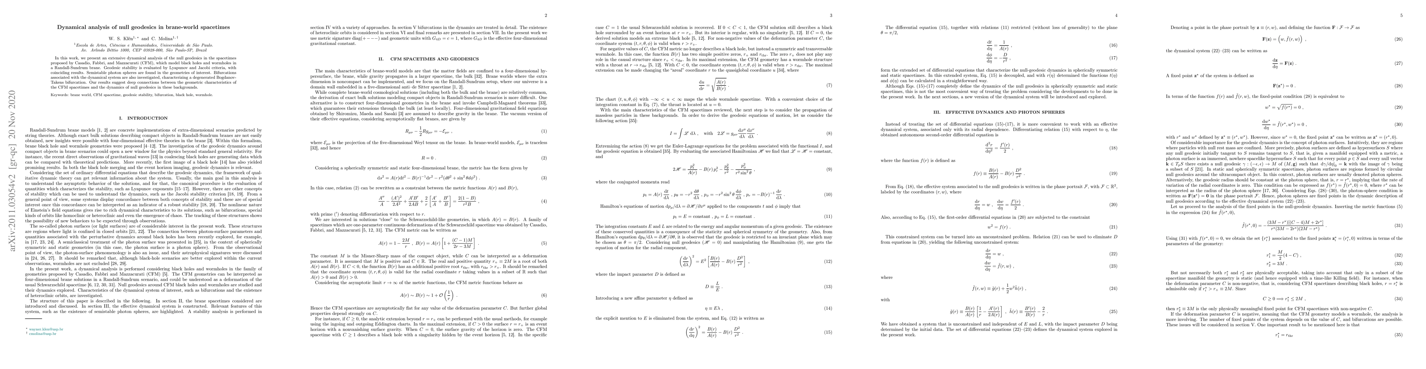 This paper conducts a dynamical analysis of null geodesics in brane-world spacetimes proposed by CFM, revealing semistable photon spheres and a degenerated Bogdan-Takens bifurcation. The study finds deep connections between the geometric properties of CFM spacetimes and the dynamics of light paths.