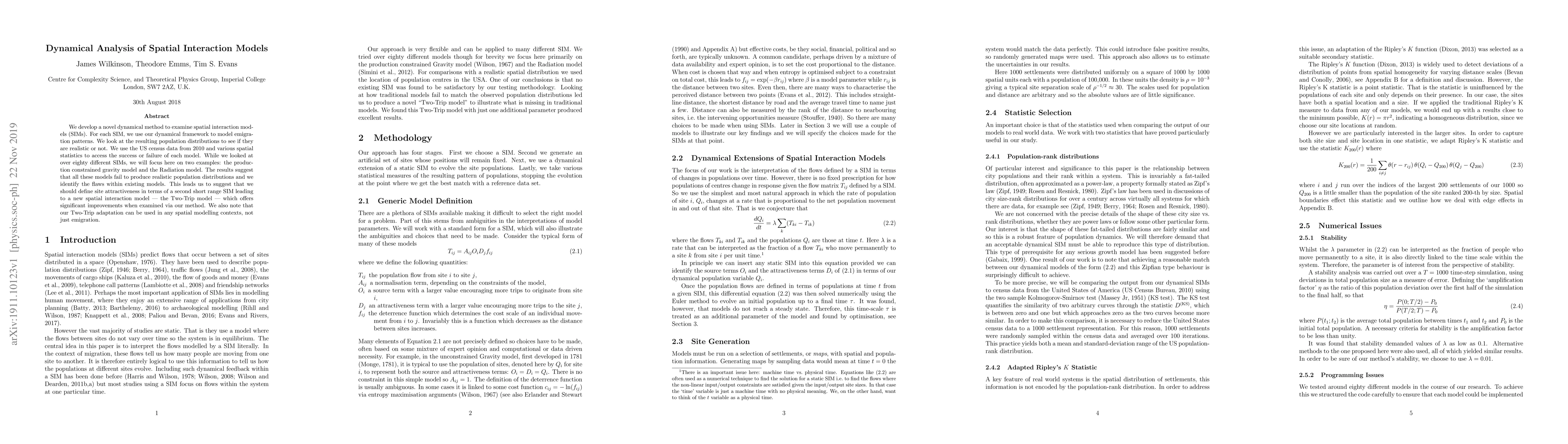 The research introduces a new dynamical method to assess spatial interaction models (SIMs), finding most fail to realistically depict population distributions. It proposes a Two-Trip model, improving accuracy, and suggests its applicability beyond emigration modeling.