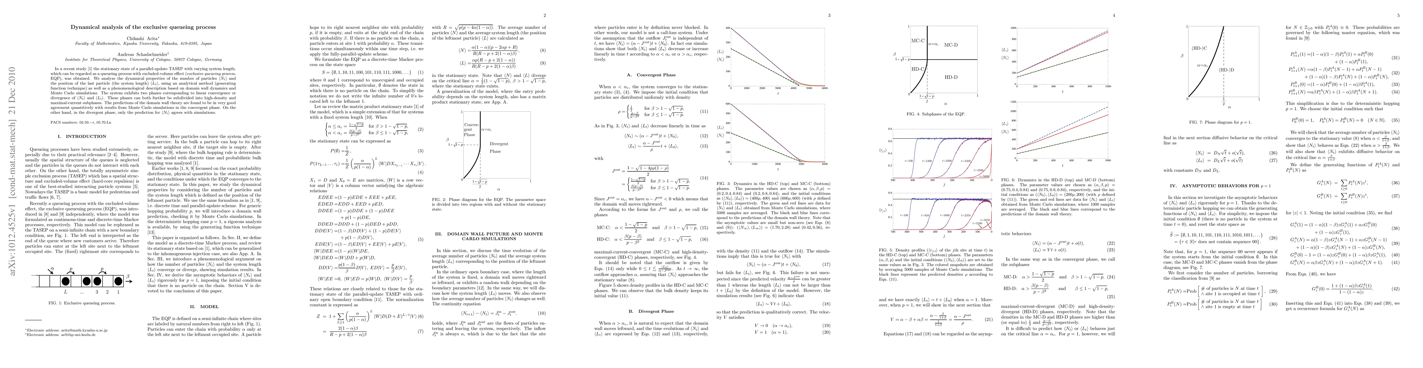 Researchers analyzed a queueing process with an exclusive effect, finding two phases with linear convergence or divergence of key metrics, which were compared to predictions from domain wall theory and Monte Carlo simulations.