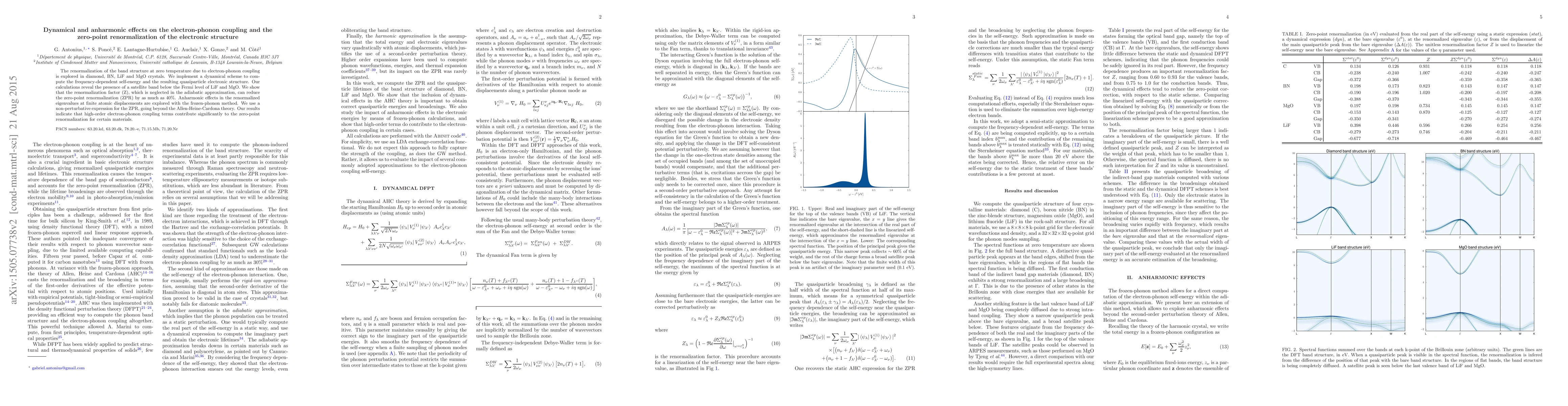 The renormalization of the band structure at zero temperature due to electron-phonon coupling is investigated in diamond, BN, LiF and MgO crystals. We implement a dynamical scheme to compute the frequency-dependent self-energy and the resulting quasiparticle electronic structure. Our calculations reveal the presence of a satellite band below the Fermi level of LiF and MgO. We show that the renormalization factor (Z), which is neglected in the adiabatic approximation, can reduce the zero-point renormalization (ZPR) by as much as 40%. Anharmonic effects in the renormalized eigenvalues at finite atomic displacements are explored with the frozen-phonon method. We use a non-perturbative expression for the ZPR, going beyond the Allen-Heine-Cardona theory. Our results indicate that high-order electron-phonon coupling terms contribute significantly to the zero-point renormalization for certain materials.