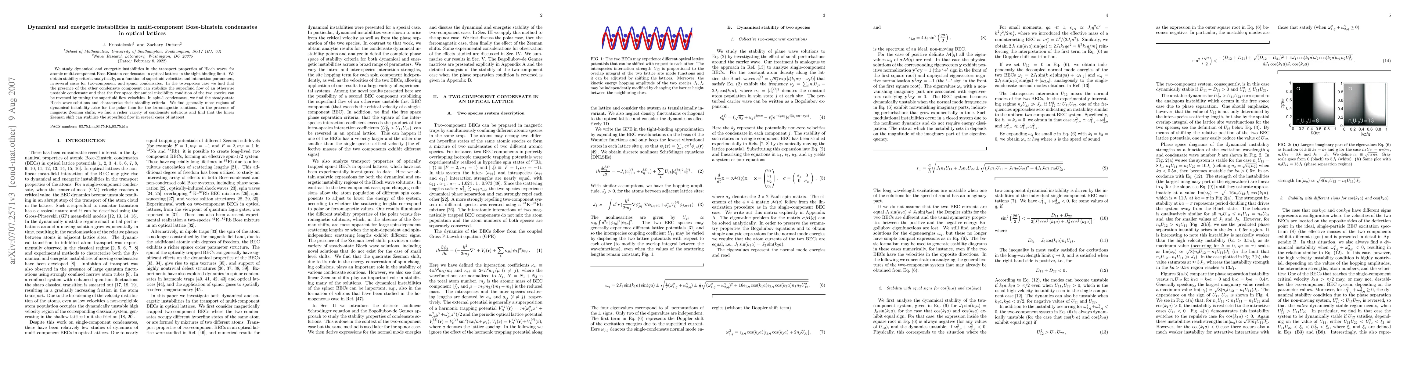 This paper investigates dynamical and energetic instabilities in multi-component Bose-Einstein condensates within optical lattices, deriving analytical stability criteria based on superfluid velocities and interaction parameters. It reveals that the presence of a second component can stabilize otherwise unstable superfluid flow and that dynamical miscibility conditions can be reversed by adjusting flow velocities, with more instability regions found in polar than ferromagnetic spin-1 condensates, and linear Zeeman shifts providing stabilization.