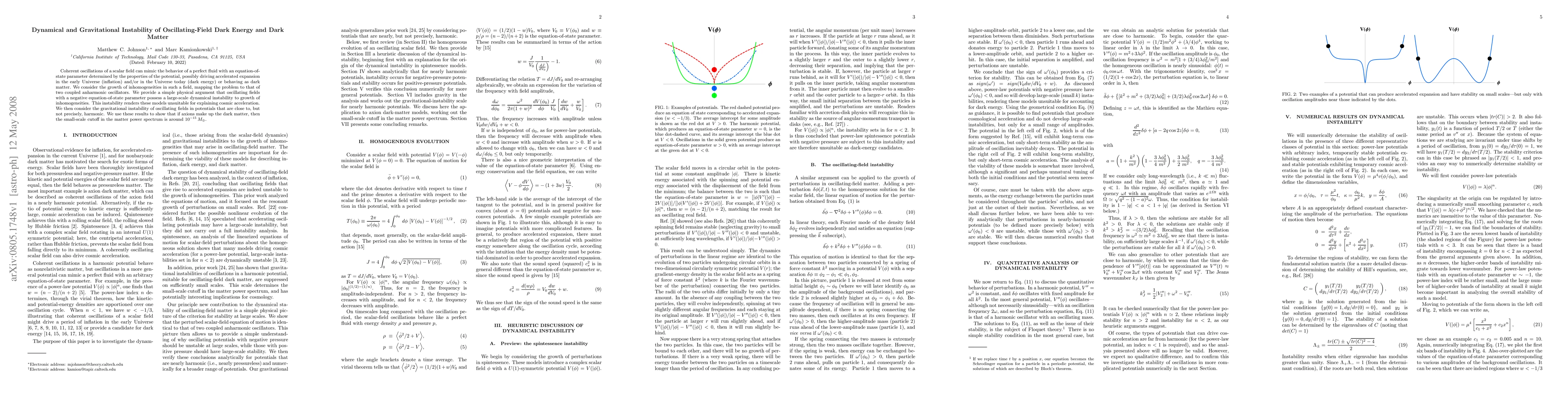 Coherent oscillations of a scalar field can mimic the behavior of a perfect fluid with an equation-of-state parameter determined by the properties of the potential, possibly driving accelerated expansion in the early Universe (inflation) and/or in the Universe today (dark energy) or behaving as dark matter. We consider the growth of inhomogeneities in such a field, mapping the problem to that of two coupled anharmonic oscillators. We provide a simple physical argument that oscillating fields with a negative equation-of-state parameter possess a large-scale dynamical instability to growth of inhomogeneities. This instability renders these models unsuitable for explaining cosmic acceleration. We then consider the gravitational instability of oscillating fields in potentials that are close to, but not precisely, harmonic. We use these results to show that if axions make up the dark matter, then the small-scale cutoff in the matter power spectrum is around $10^{-15} M_\oplus$.