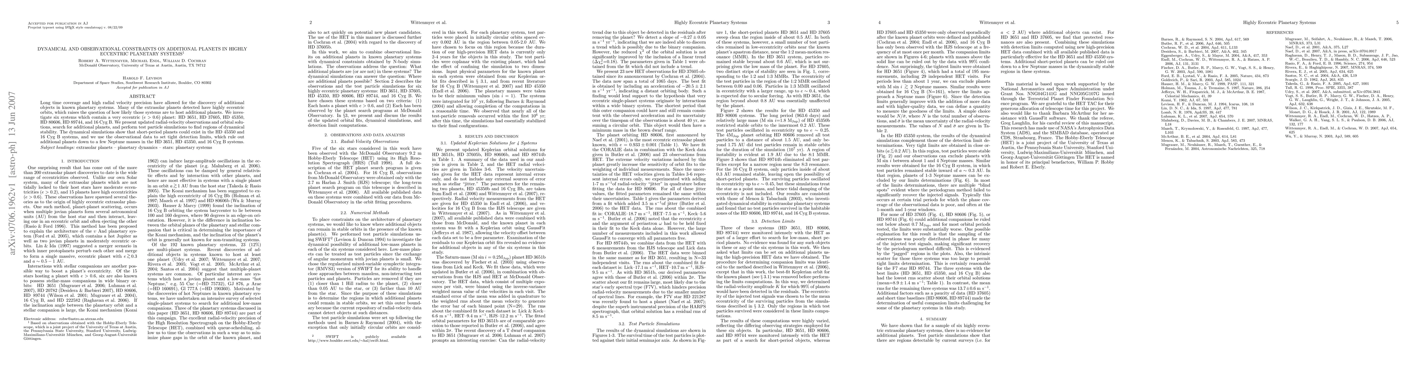 This paper investigates the likelihood of additional planets in six highly eccentric extrasolar planetary systems using updated radial-velocity observations and dynamical simulations. The study finds potential stability for short-period planets in HD 45350 and 16 Cyg B, while ruling out additional planets in several systems down to a few Neptune masses.