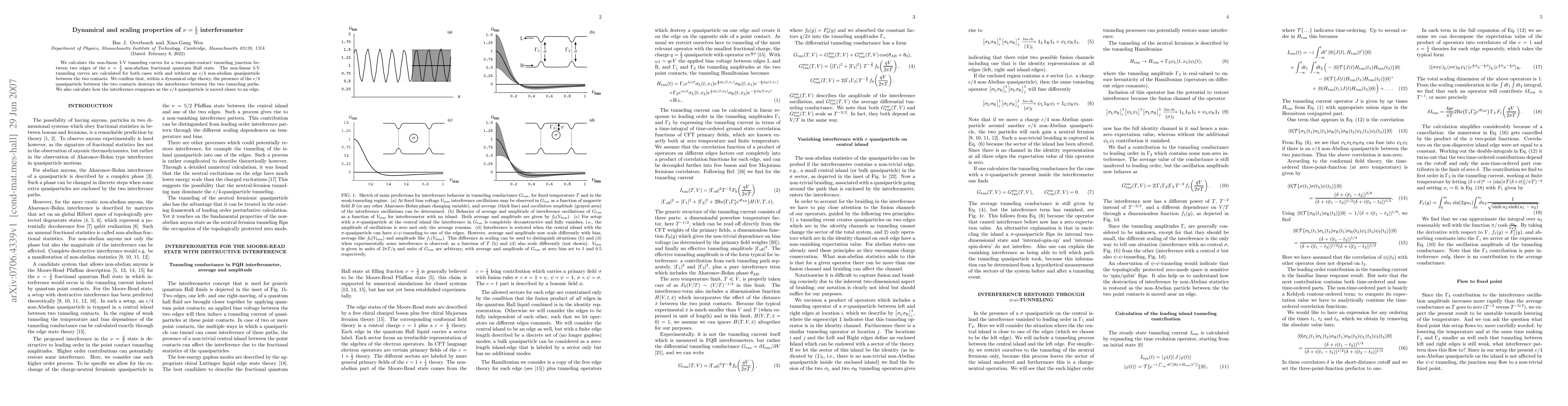 We calculate the non-linear I-V tunneling curves for a two-point-contact tunneling junction between two edges of the $\nu={5/2}$ non-abelian fractional quantum Hall state. The non-linear I-V tunneling curves are calculated for both cases with and without an $e/4$ non-abelian quasiparticle between the two contacts. We confirm that, within a dynamical edge theory, the presence of the $e/4$ quasiparticle between the two contacts destroys the interference between the two tunneling paths. We also calculate how the interference reappears as the $e/4$ quasiparticle is moved closer to an edge.