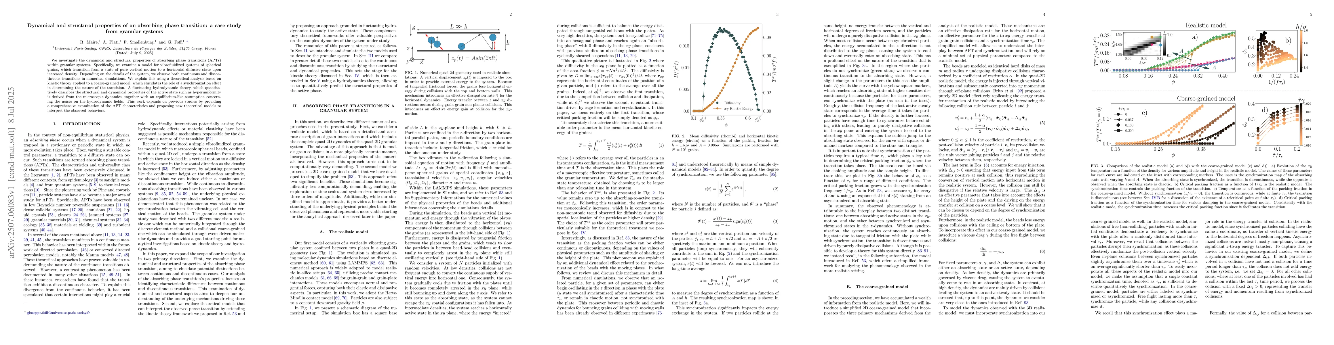We investigate the dynamical and structural properties of absorbing phase transitions (APTs) within granular systems. Specifically, we examine a model for vibrofluidized systems of spherical grains, which transition from a state of pure vertical motion to a horizontal diffusive state upon increased density. Depending on the details of the system, we observe both continuous and discontinuous transitions in numerical simulations. We explain this using a theoretical analysis based on kinetic theory applied to a coarse-grained model, which elucidates the role of a synchronization effect in determining the nature of the transition. A fluctuating hydrodynamic theory, which quantitatively describes the structural and dynamical properties of the active state such as hyperuniformity is derived from the microscopic dynamics, together with an equilibrium-like assumption concerning the noises on the hydrodynamic fields. This work expands on previous studies by providing a comprehensive examination of the APT characteristics and proposing new theoretical models to interpret the observed behaviors.