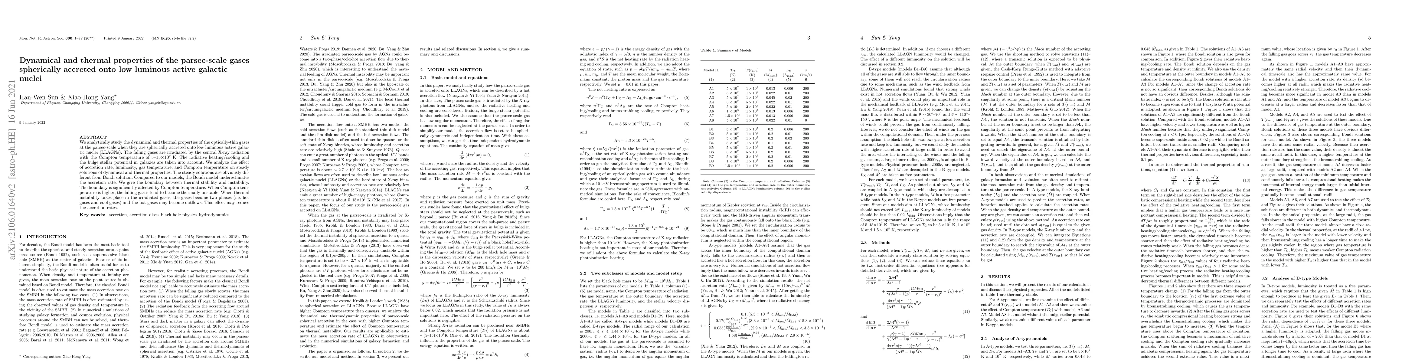 We analytically study the dynamical and thermal properties of the optically-thin gases at the parsec-scale when they are spherically accreted onto low luminous active galactic nuclei (LLAGNs). The falling gases are irradiated by the central X-ray radiation with the Compton temperature of 5--15$\times10^7$ K. The radiative heating/cooling and the bulge stellar potential in galaxies are taken into account. We analyze the effect of accretion rate, luminosity, gas temperature, and Compton temperature on steady solutions of dynamical and thermal properties. The steady solutions are obviously different from Bondi solution. Compared to our models, the Bondi model underestimates the accretion rate. We give the boundary between thermal stability and instability. The boundary is significantly affected by Compton temperature. When Compton temperature is higher, the falling gases tend to become thermally unstable. When thermal instability takes place in the irradiated gases, the gases become two phases (i.e. hot gases and cool gases) and the hot gases may become outflows. This effect may reduce the accretion rates.