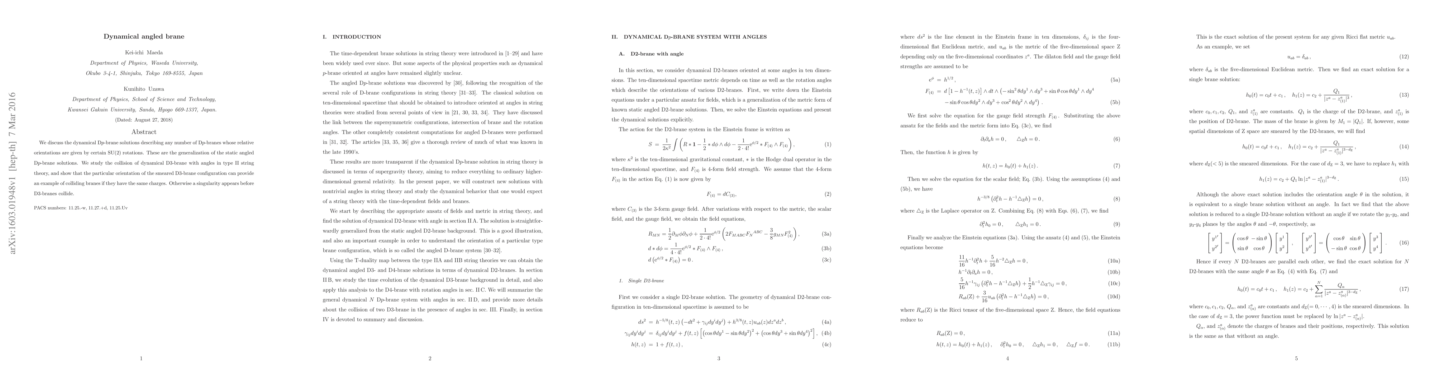 This paper explores dynamical D$p$-brane solutions in type II string theory, generalizing static angled D$p$-branes through SU(2) rotations. It specifically examines the collision dynamics of D3-branes with angled orientations, revealing that same-charge configurations can collide without singularity, while different charges lead to a pre-collision singularity.