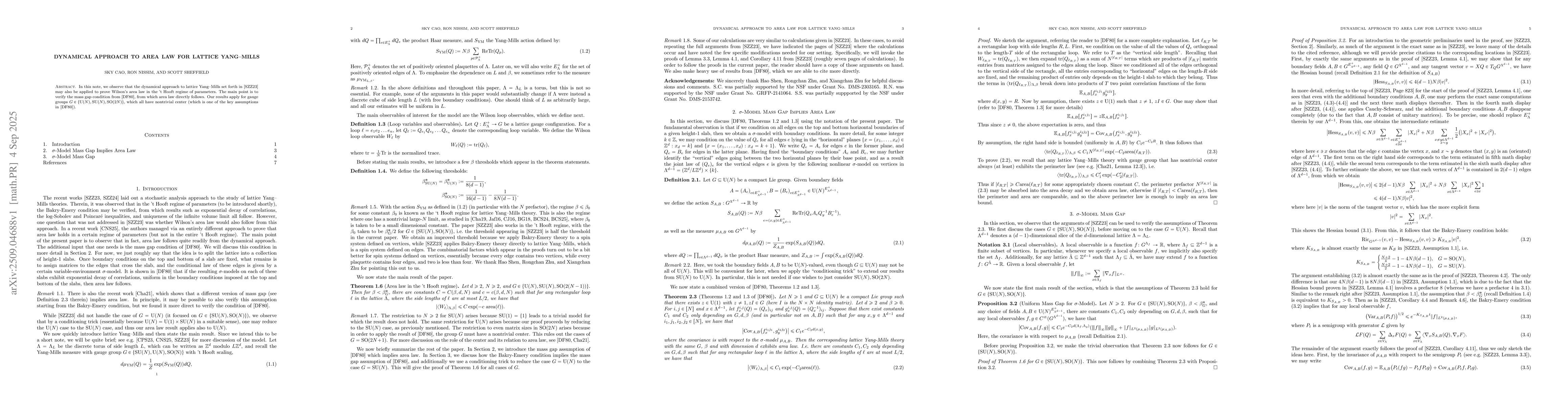 In this note, we observe that the dynamical approach to lattice Yang-Mills set forth in [SZZ23] may also be applied to prove Wilson's area law in the 't Hooft regime of parameters. The main point is to verify the mass gap condition from [DF80], from which area law directly follows. Our results apply for gauge groups $G \in \{\mathrm{U}(N), \mathrm{SU}(N), \mathrm{SO}(2N)\}$, which all have nontrivial center (which is one of the key assumptions in [DF80]).