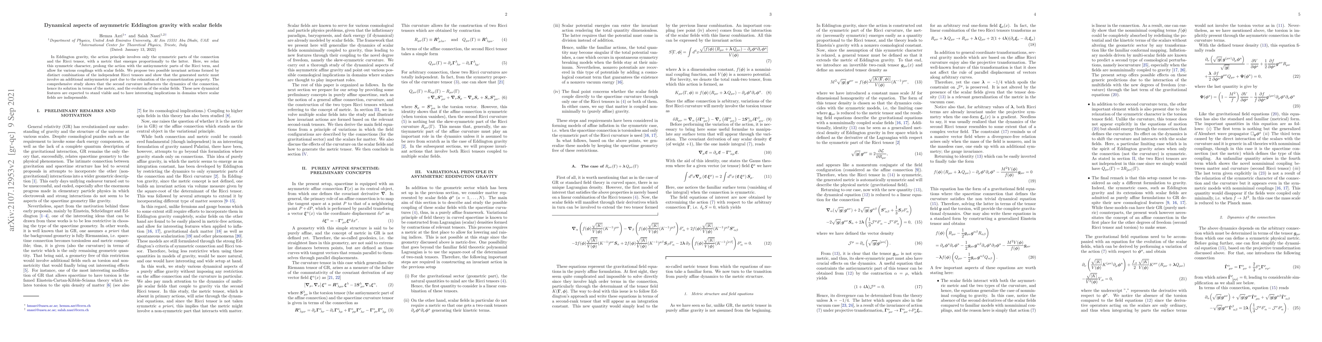 In Eddington gravity, the action principle involves only the symmetric parts of the connection and the Ricci tensor, with a metric that emerges proportionally to the latter. Here, we relax this symmetric character, prolong the action with the antisymmetric parts of the Ricci term, and allow for various couplings with scalar fields. We propose two possible invariant actions formed by distinct combinations of the independent Ricci tensors and show that the generated metric must involve an additional antisymmetric part due to the relaxation of the symmetrization property. The comprehensive study shows that the second curvature influences the dynamics of the connection, hence its solution in terms of the metric, and the evolution of the scalar fields. These new dynamical features are expected to stand viable and to have interesting implications in domains where scalar fields are indispensable.