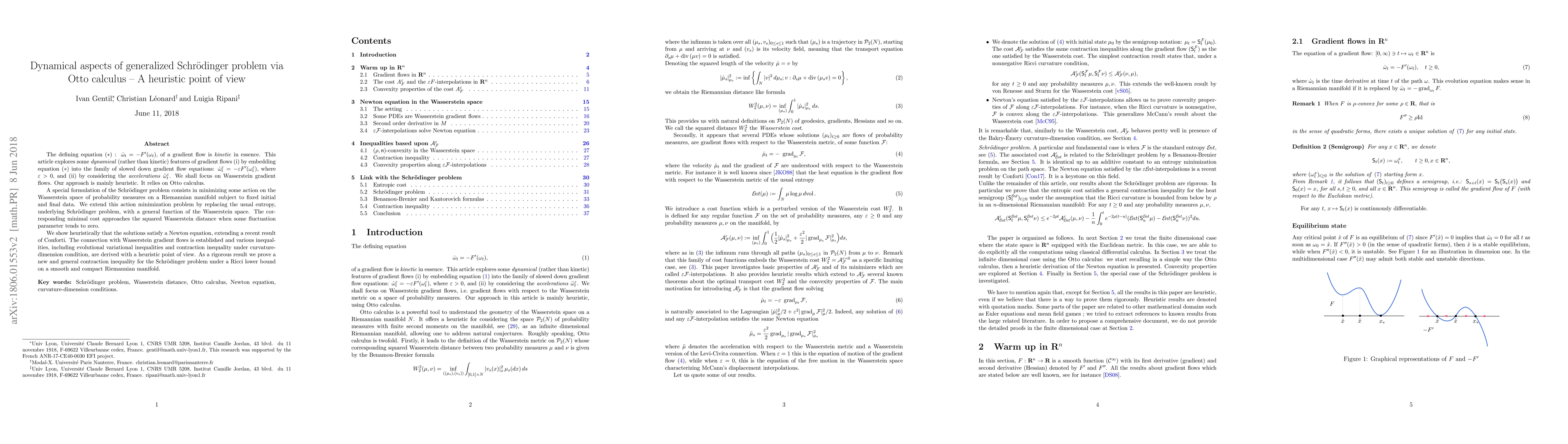 The defining equation $(\ast):\ \dot \omega\_t=-F'(\omega\_t),$ of a gradient flow is kinetic in essence. This article explores some dynamical (rather than kinetic) features of gradient flows (i) by embedding equation $(\ast)$ into the family of slowed down gradient flow equations: $\dot \omega ^{ \varepsilon}\_t=- \varepsilon F'( \omega ^{ \varepsilon}\_t),$ where $\varepsilon>0$, and (ii) by considering the \emph{accelerations} $\ddot \omega ^{ \varepsilon}\_t$. We shall focus on Wasserstein gradient flows. Our approach is mainly heuristic. It relies on Otto calculus.A special formulation of the Schr{\"o}dinger problem consists in minimizing some action on the Wasserstein space of probability measures on a Riemannian manifold subject to fixed initial and final data. We extend this action minimization problem by replacing the usual entropy, underlying Schr{\"o}dinger problem, with a general function of the Wasserstein space. The corresponding minimal cost approaches the squared Wasserstein distance when some fluctuation parameter tends to zero. We show heuristically that the solutions satisfy a Newton equation, extending a recent result of Conforti. The connection with Wasserstein gradient flows is established and various inequalities, including evolutional variational inequalities and contraction inequality under curvature-dimension condition, are derived with a heuristic point of view. As a rigorous result we prove a new and general contraction inequality for the Schr{\"o}dinger problem under a Ricci lower bound on a smooth and compact Riemannian manifold.