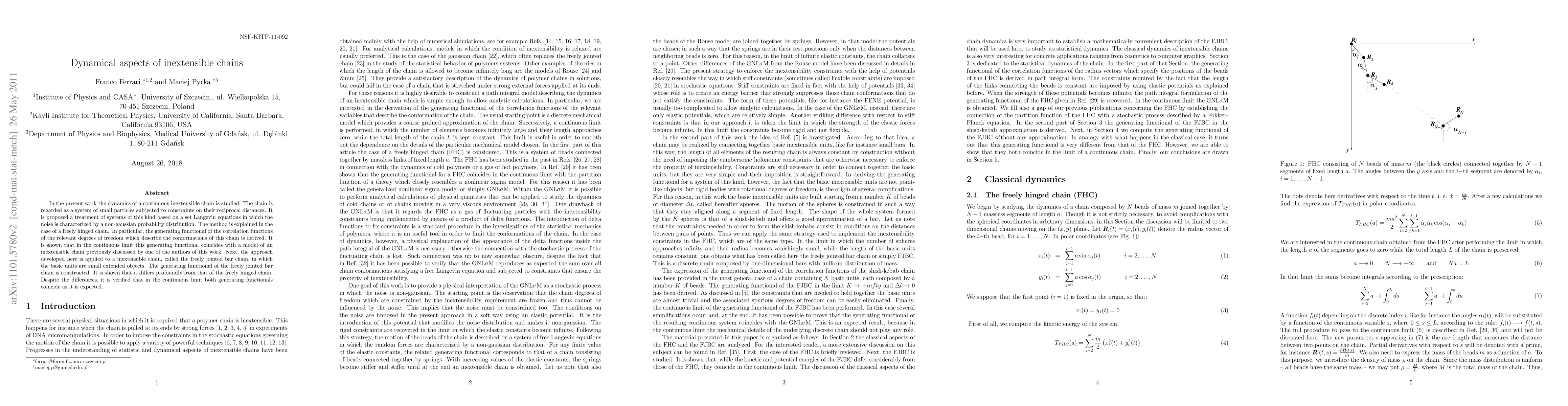 In the present work the dynamics of a continuous inextensible chain is studied. The chain is regarded as a system of small particles subjected to constraints on their reciprocal distances. It is proposed a treatment of systems of this kind based on a set Langevin equations in which the noise is characterized by a non-gaussian probability distribution. The method is explained in the case of a freely hinged chain. In particular, the generating functional of the correlation functions of the relevant degrees of freedom which describe the conformations of this chain is derived. It is shown that in the continuous limit this generating functional coincides with a model of an inextensible chain previously discussed by one of the authors of this work. Next, the approach developed here is applied to a inextensible chain, called the freely jointed bar chain, in which the basic units are small extended objects. The generating functional of the freely jointed bar chain is constructed. It is shown that it differs profoundly from that of the freely hinged chain. Despite the differences, it is verified that in the continuous limit both generating functionals coincide as it is expected.