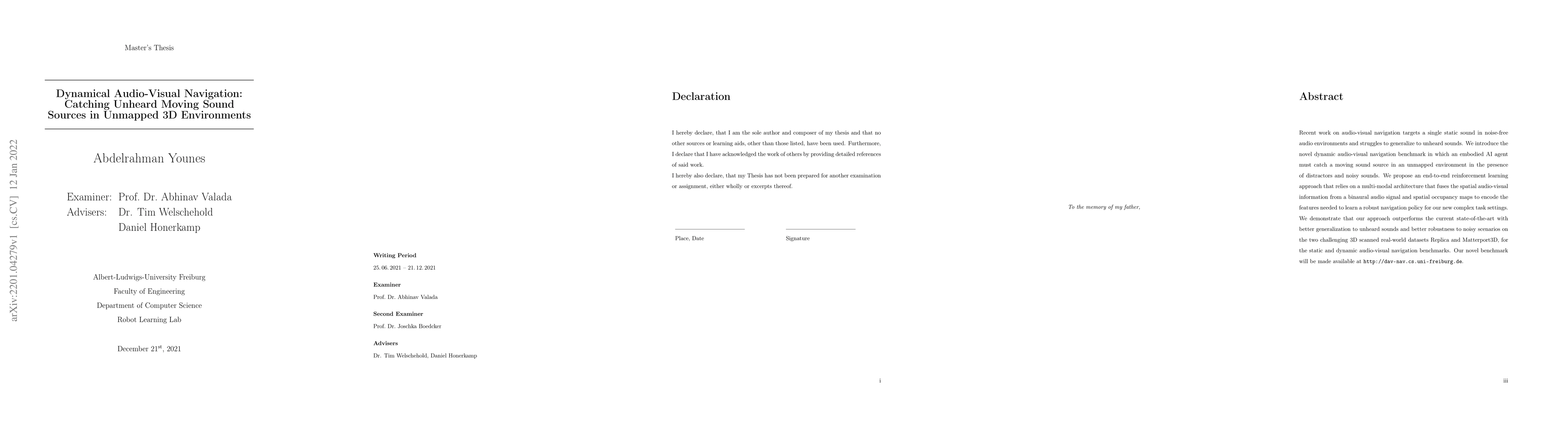 This paper introduces a new dynamic audio-visual navigation benchmark for catching moving sound sources in unmapped 3D environments amidst distractors and noise. It proposes a reinforcement learning approach that fuses binaural audio and spatial maps, achieving superior performance over current methods on real-world datasets.