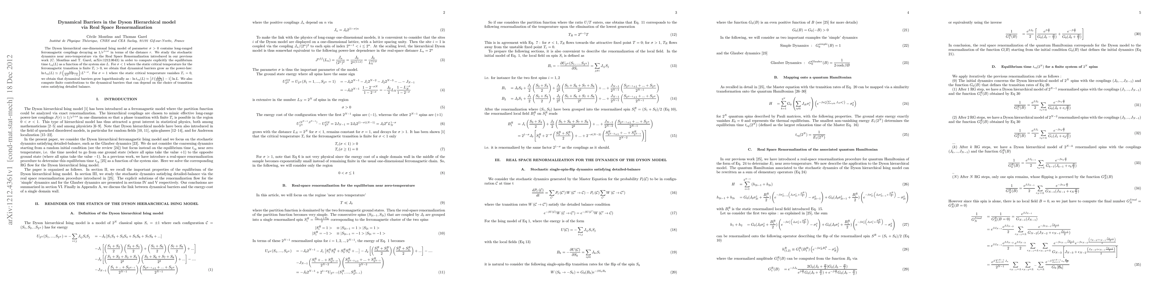 This paper investigates the dynamical barriers in the Dyson hierarchical one-dimensional Ising model using Real Space Renormalization, finding power-law growth for $\sigma<1$ and logarithmic growth for $\sigma=1$. The study computes equilibrium time as a function of system size, revealing distinct scaling behaviors for different values of $\sigma$.