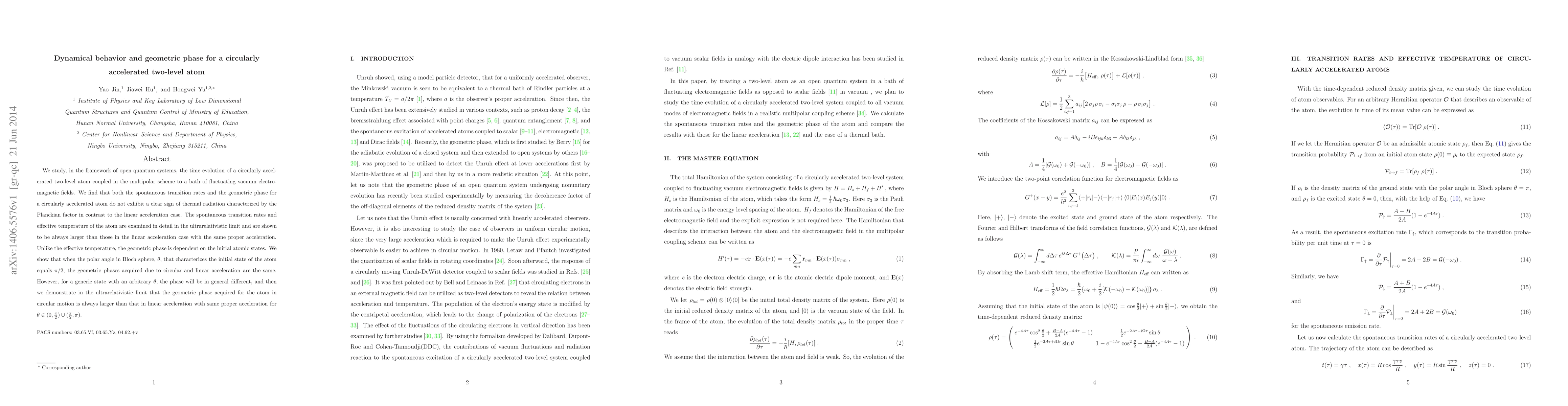 We study, in the framework of open quantum systems, the time evolution of a circularly accelerated two-level atom coupled in the multipolar scheme to a bath of fluctuating vacuum electromagnetic fields. We find that both the spontaneous transition rates and the geometric phase for a circularly accelerated atom do not exhibit a clear sign of thermal radiation characterized by the Planckian factor in contrast to the linear acceleration case. The spontaneous transition rates and effective temperature of the atom are examined in detail in the ultrarelativistic limit and are shown to be always larger than those in the linear acceleration case with the same proper acceleration. Unlike the effective temperature, the geometric phase is dependent on the initial atomic states. We show that when the polar angle in Bloch sphere, $\theta$, that characterizes the initial state of the atom equals $\pi/{2}$, the geometric phases acquired due to circular and linear acceleration are the same. However, for a generic state with an arbitrary $\theta$, the phase will be in general different, and then we demonstrate in the ultrarelativistic limit that the geometric phase acquired for the atom in circular motion is always larger than that in linear acceleration with same proper acceleration for $\theta\in(0,\frac{\pi}{2})\cup(\frac{\pi}{2},\pi)$.