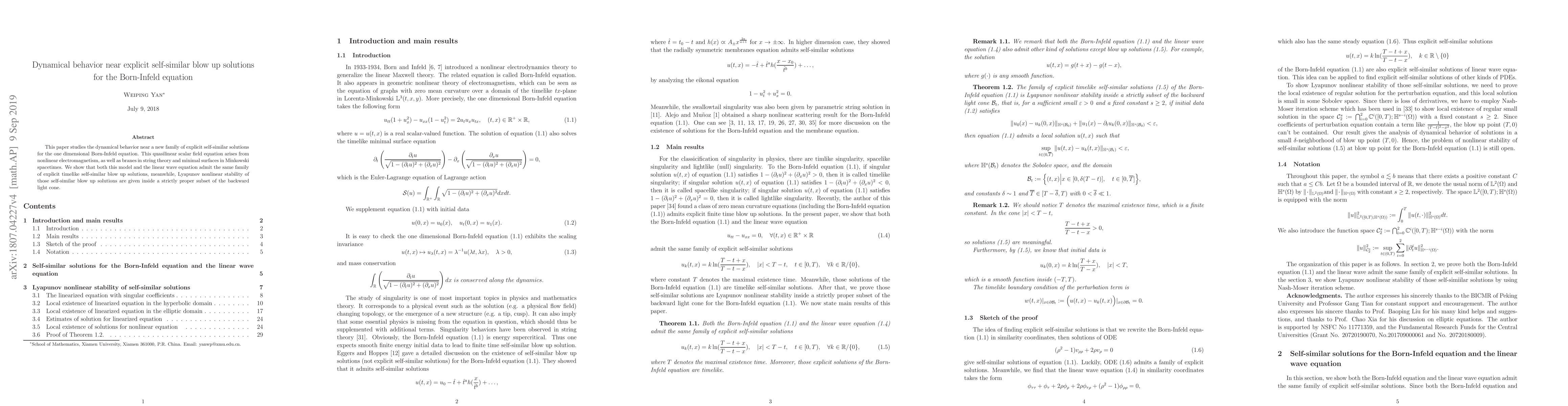 This paper investigates the dynamical behavior near explicit self-similar blow-up solutions for the one-dimensional Born-Infeld equation, revealing its nonlinear stability within a specific region of the backward light cone, and finds similar blow-up solutions in the linear wave equation.