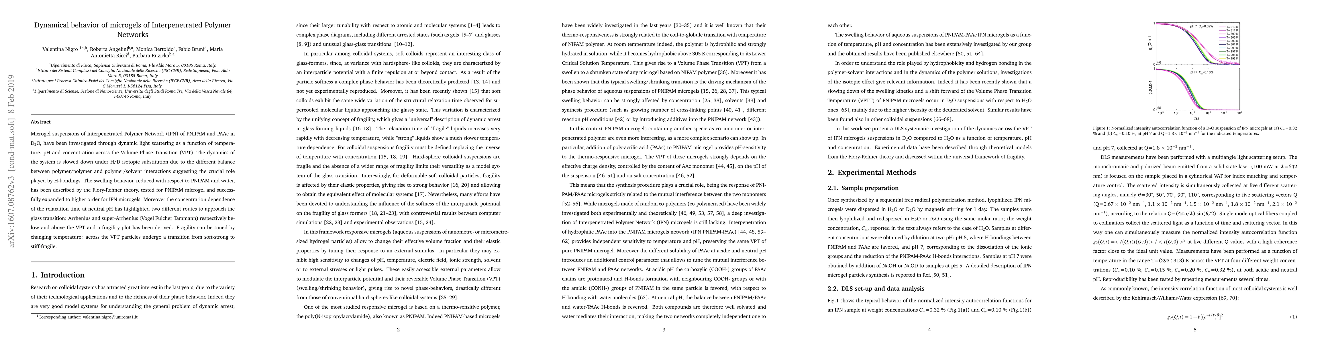 This study investigates the dynamic behavior of IPN microgels composed of PNIPAM and PAAc in D$_2$O, revealing slowed dynamics due to H-bonding under H/D substitution. The swelling behavior is described by the Flory-Rehner theory, and the concentration dependence of relaxation time shows two distinct routes to the glass transition, with fragility tunable across the Volume Phase Transition.