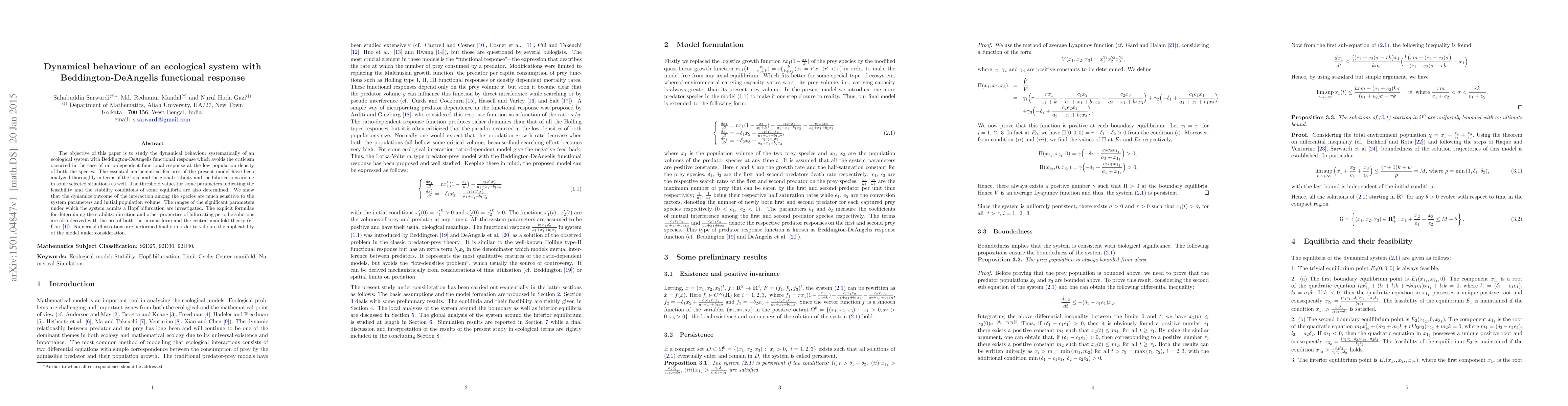 The objective of this paper is to study the dynamical behaviour systematically of an ecological system with Beddington-DeAngelis functional response which avoids the criticism occurred in the case of ratio-dependent functional response at the low population density of both the species. The essential mathematical features of the present model have been analyzed thoroughly in terms of the local and the global stability and the bifurcations arising in some selected situations as well. The threshold values for some parameters indicating the feasibility and the stability conditions of some equilibria are also determined. We show that the dynamics outcome of the interaction among the species are much sensitive to the system parameters and initial population volume. The ranges of the significant parameters under which the system admits a Hopf bifurcation are investigated. The explicit formulae for determining the stability, direction and other properties of bifurcating periodic solutions are also derived with the use of both the normal form and the central manifold theory (cf. Carr \cite{Carr}). Numerical illustrations are performed finally in order to validate the applicability of the model under consideration.