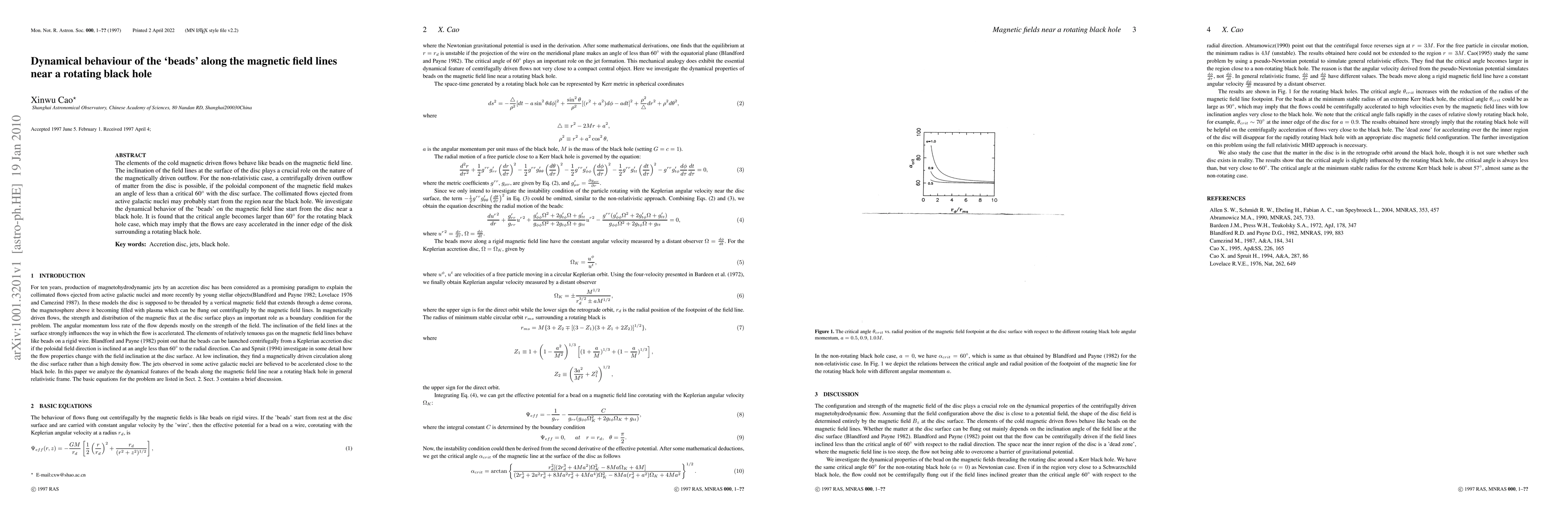 The elements of the cold magnetic driven flows behave like beads on the magnetic field line. The inclination of the field lines at the surface of the disc plays a crucial role on the nature of the magnetically driven outflow. For the non-relativistic case, a centrifugally driven outflow of matter from the disc is possible, if the poloidal component of the magnetic field makes an angle of less than a critical 60 degrees with the disc surface. The collimated flows ejected from active galactic nuclei may probably start from the region near the black hole. We investigate the dynamical behavior of the 'beads' on the magnetic field line start from the disc near a black hole. It is found that the critical angle becomes larger than 60 degrees for the rotating black hole case (close to 90 degrees for a=1), which may imply that the flows are easy accelerated in the inner edge of the disk surrounding a rotating black hole.