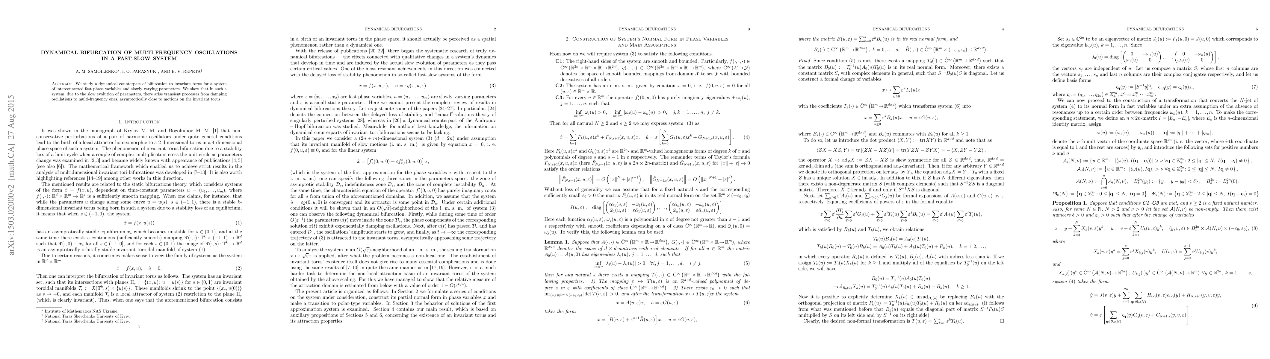 This paper investigates the bifurcation of invariant tori in a fast-slow dynamical system, demonstrating how transient processes can lead from damping oscillations to multi-frequency oscillations, approaching motions on the invariant torus due to the slow evolution of parameters.
