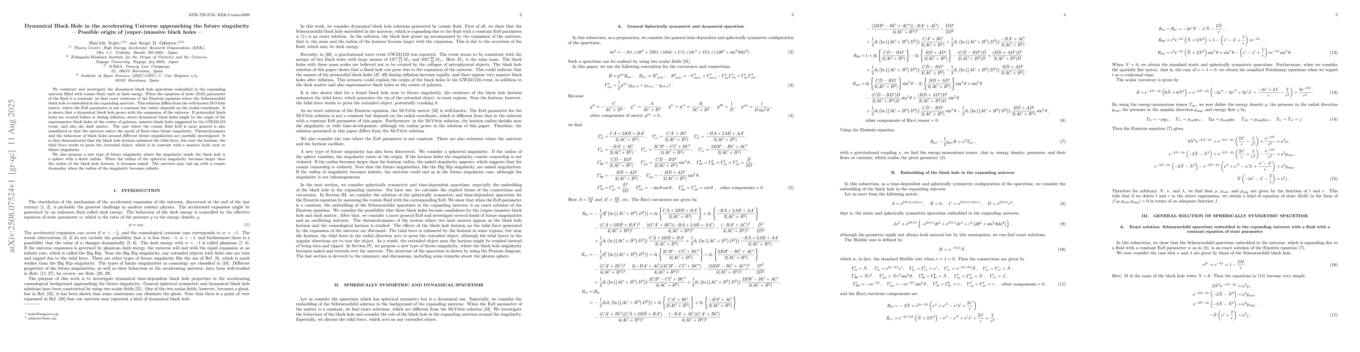 We construct and investigate the dynamical black hole spacetime embedded in the expanding universe filled with cosmic fluid, such as dark energy. When the equation of state (EoS) parameter of the fluid is a constant, we find exact solutions of the Einstein equation where the Schwarzschild black hole is embedded in the expanding universe. This solution differs from the well-known McVittie metric, where the EoS parameter is not a constant but rather depends on the radial coordinate. It is shown that a dynamical black hole grows with the expansion of the universe. If primordial black holes are created before or during inflation, above dynamical black holes might be the origin of the supermassive black holes at the centre of galaxies, massive black holes suggested by the GW231123 event, and also the dark matter. The case where the cosmic fluid EoS is more general is also considered so that the universe enters the epoch of finite-time future singularity. Thermodynamics and the behaviour of black holes around different future singularities are carefully investigated. It is then demonstrated that the black hole horizon enhances the tidal force, but near the horizon, the tidal force works to press the extended object, which is in contrast with a massive body near to future singularity. We also propose a new type of future singularity where the singularity inside the black hole is a sphere with a finite radius. When the radius of the spherical singularity becomes larger than the radius of the black hole horizon, it becomes naked. The universe may end up with a cosmic doomsday when the radius of the singularity becomes infinite.