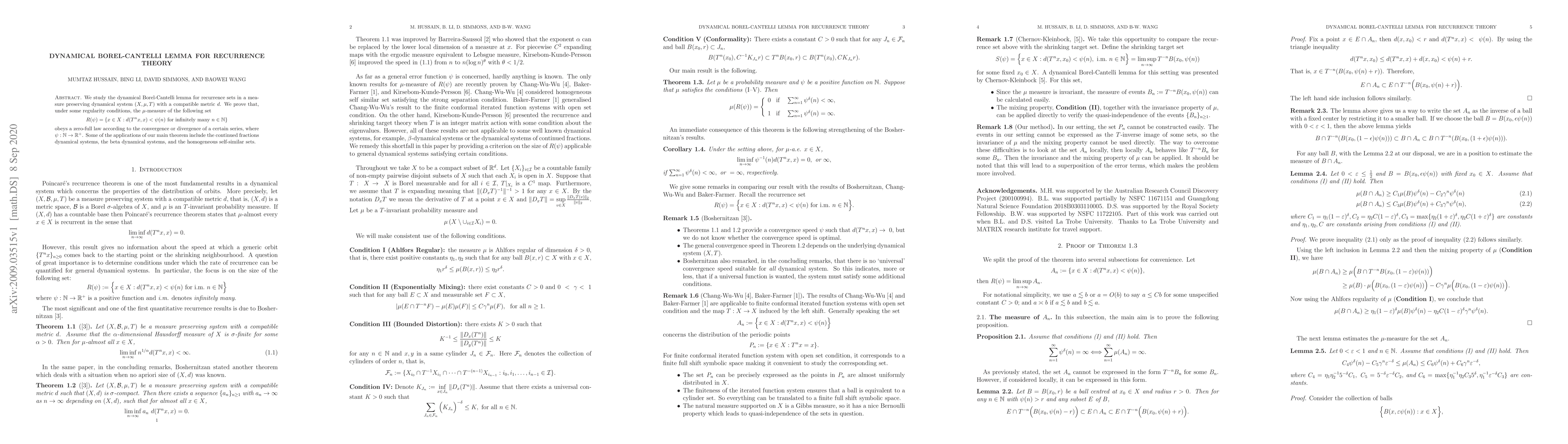 We study the dynamical Borel-Cantelli lemma for recurrence sets in a measure preserving dynamical system $(X, \mu, T)$ with a compatible metric $d$. We prove that, under some regularity conditions, the $\mu$-measure of the following set \[ R(\psi)= \{x\in X : d(T^n x, x) < \psi(n)\ \text{for infinitely many}\ n\in\N \} \] obeys a zero-full law according to the convergence or divergence of a certain series, where $\psi:\N\to\R^+$. Some of the applications of our main theorem include the continued fractions dynamical systems, the beta dynamical systems, and the homogeneous self-similar sets.