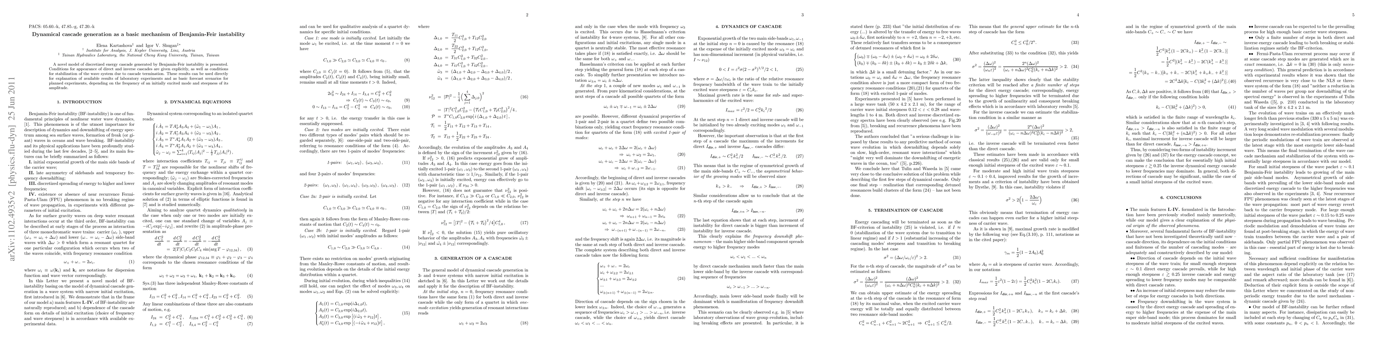 A novel model of discretized energy cascade generated by Benjamin-Feir instability is presented. Conditions for appearance of direct and inverse cascades are given explicitly, as well as conditions for stabilization of the wave system due to cascade termination. These results can be used directly for explanation of available results of laboratory experiments and as basic forecast scenarios for planned experiments, depending on the frequency of an initially excited mode and steepness of its amplitude.