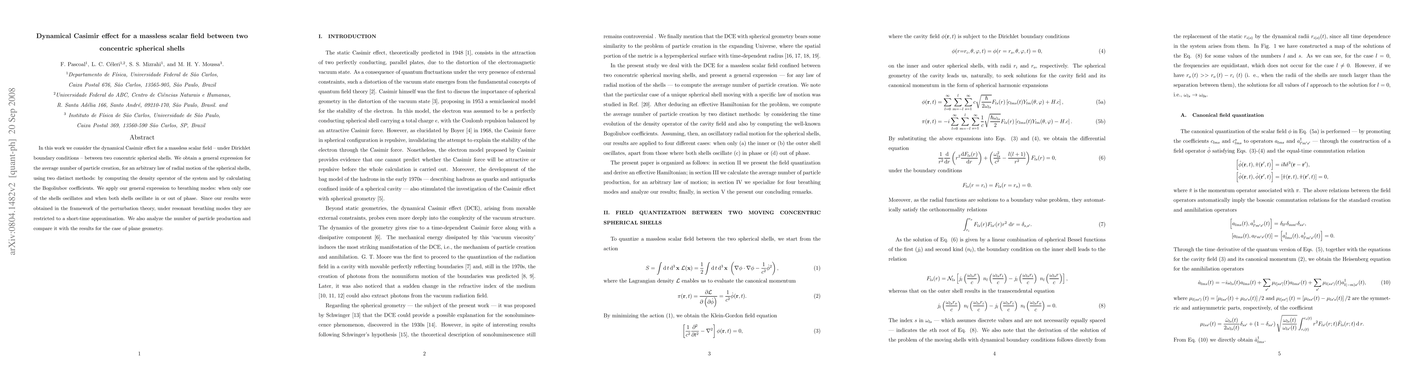 This study investigates the dynamical Casimir effect for a massless scalar field in the space between two concentric spherical shells, deriving a general expression for particle creation under various radial motion laws. It applies this to breathing modes and compares particle production results with those from plane geometry.