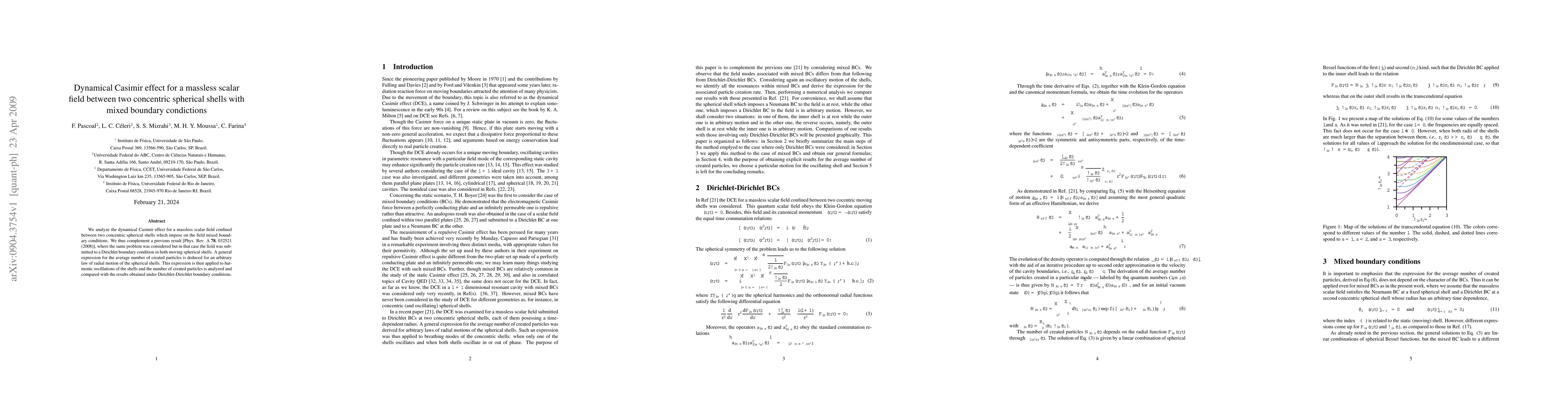 This paper investigates the dynamical Casimir effect for a massless scalar field between two concentric spherical shells with mixed boundary conditions, deriving a general expression for particle creation. It compares the results with previous findings under Dirichlet boundary conditions and analyzes particle creation for harmonic oscillations.