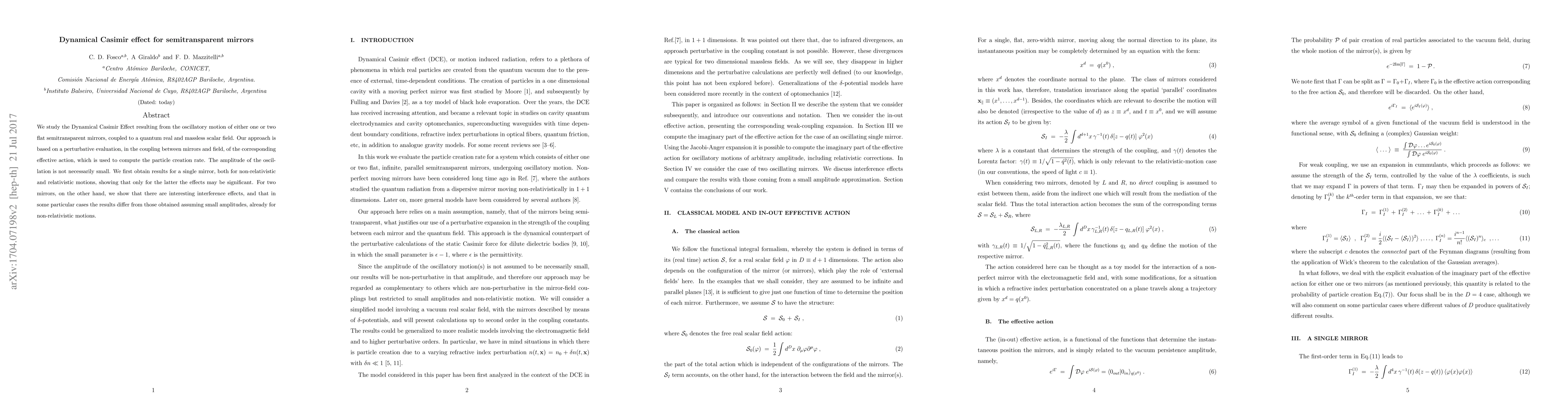 This paper investigates the Dynamical Casimir Effect from oscillating semitransparent mirrors coupled to a quantum scalar field, employing a perturbative method to compute particle creation rates. It finds significant effects for relativistic single-mirror motion and unique interference effects for two-mirror configurations, even for non-relativistic oscillations.