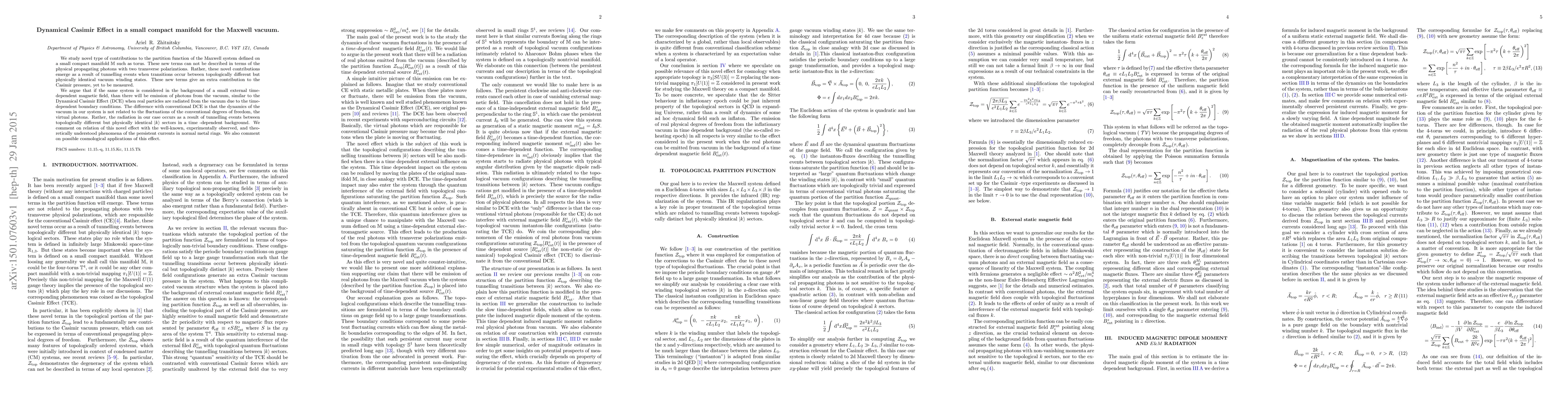 We study novel type of contributions to the partition function of the Maxwell system defined on a small compact manifold ${\mathbb{M}}$ such as torus. These new terms can not be described in terms of the physical propagating photons with two transverse polarizations. Rather, these novel contributions emerge as a result of tunnelling events when transitions occur between topologically different but physically identical vacuum winding states. These new terms give an extra contribution to the Casimir pressure, yet to be measured. We argue that if the same system is considered in the background of a small external time-dependent magnetic field, than there will be emission of photons from the vacuum, similar to the Dynamical Casimir Effect (DCE) when real particles are radiated from the vacuum due to the time-dependent boundary conditions. The difference with conventional DCE is that the dynamics of the vacuum in our system is not related to the fluctuations of the conventional degrees of freedom, the virtual photons. Rather, the radiation in our case occurs as a result of tunnelling events between topologically different but physically identical $|k>$ sectors in a time -dependent background. We comment on relation of this novel effect with the well-known, experimentally observed, and theoretically understood phenomena of the persistent currents in normal metal rings. We also comment on possible cosmological applications of this effect.