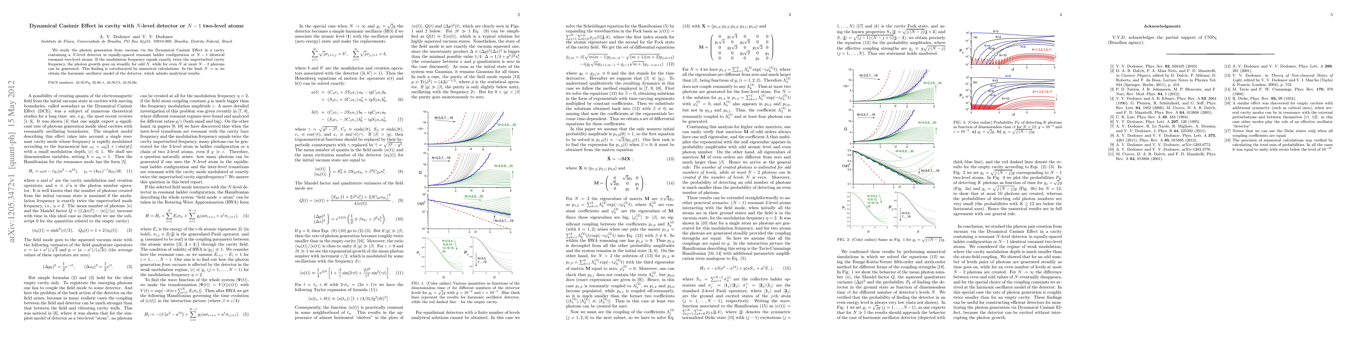 This paper investigates the Dynamical Casimir Effect in a cavity with either an N-level detector or N-1 identical two-level atoms, finding that photon generation depends on the modulation frequency and the detector's configuration, with steady photon growth for odd N and limited generation for even N. Analytical and numerical results converge in the limit of large N.