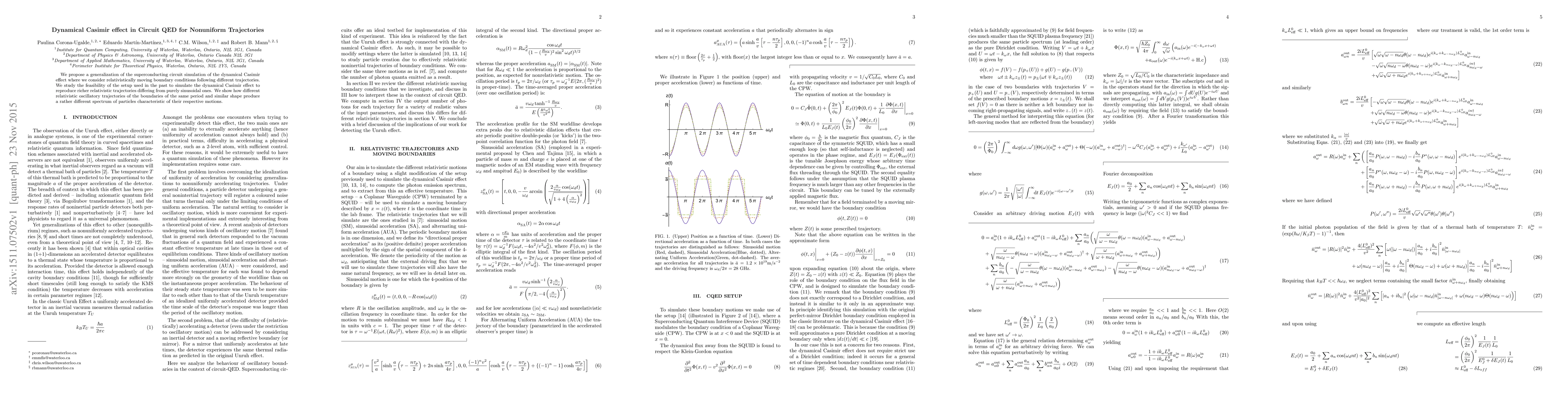 This research proposes a generalization of the dynamical Casimir effect simulation in circuit quantum electrodynamics (QED) to include nonuniform trajectories. It explores how varying relativistic boundary conditions can produce distinct particle spectra, differing from the results of purely sinusoidal motions.