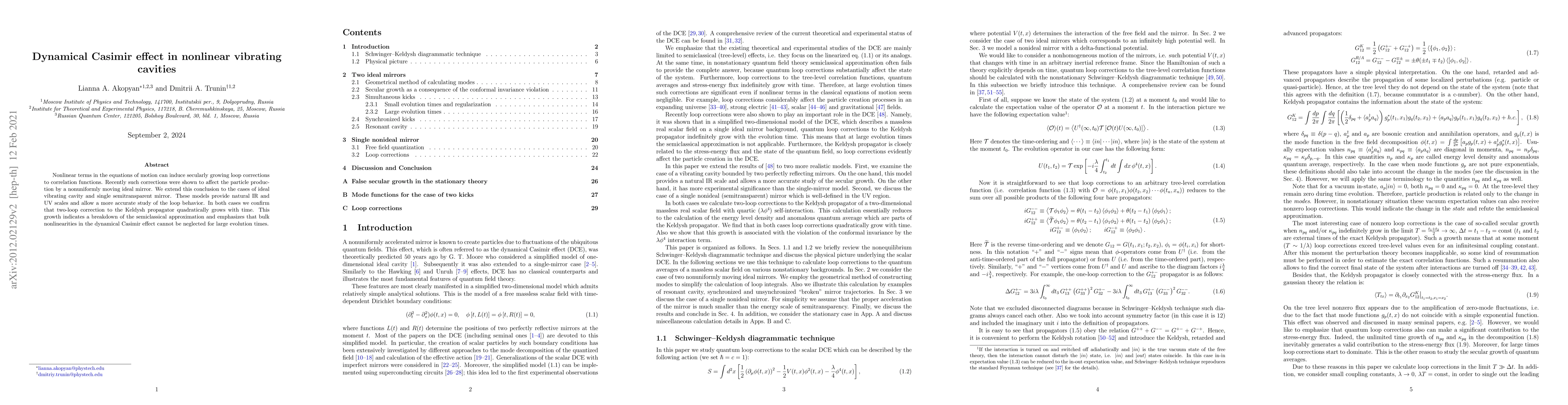 This paper explores the dynamical Casimir effect in nonlinear vibrating cavities, demonstrating that loop corrections due to nonlinear terms in the equations of motion lead to a quadratically growing two-loop correction to the Keldysh propagator over time, indicating a breakdown of the semiclassical approximation and the necessity of considering bulk nonlinearities for extended evolution periods.