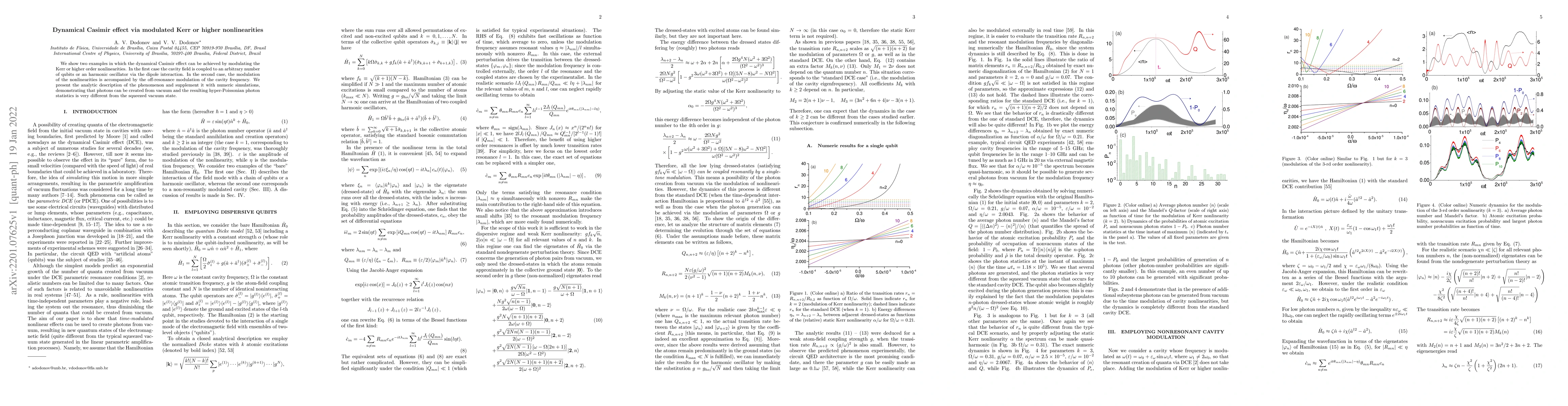 This paper demonstrates the dynamical Casimir effect through modulated Kerr or higher-order nonlinearities, showing photon creation from vacuum in two scenarios: one involving qubit or oscillator coupling and another with off-resonance cavity frequency modulation. Numerical simulations confirm the distinct hyper-Poissonian photon statistics.