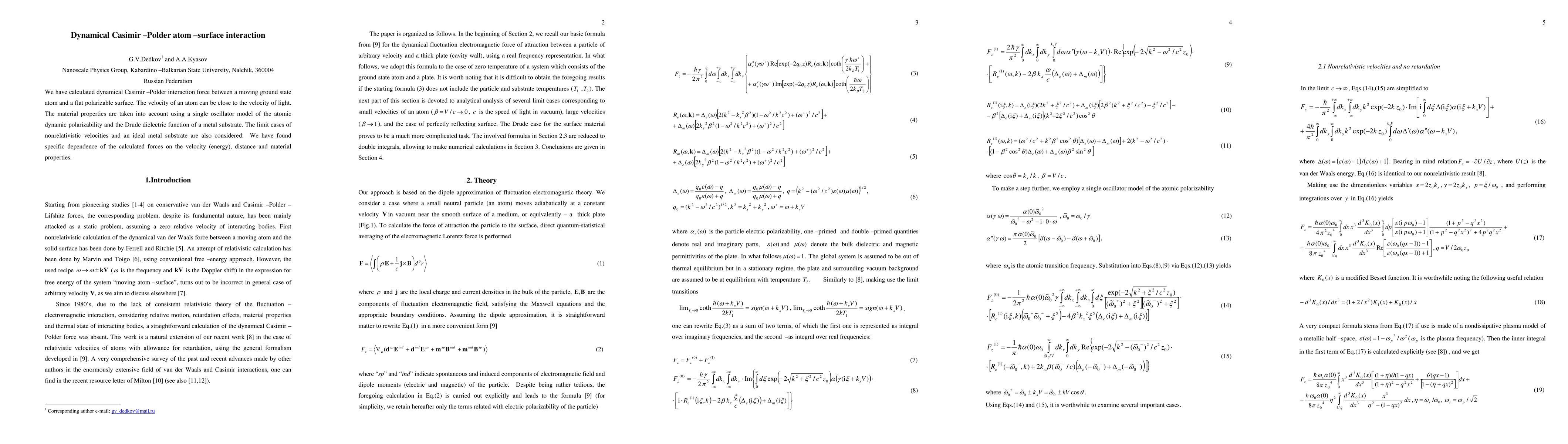 This research investigates the dynamical Casimir-Polder interaction between a fast-moving ground state atom and a polarizable metal surface, revealing velocity-dependent forces influenced by material properties and distance. The study employs a single oscillator model and Drude function to analyze relativistic and nonrelativistic limits.
