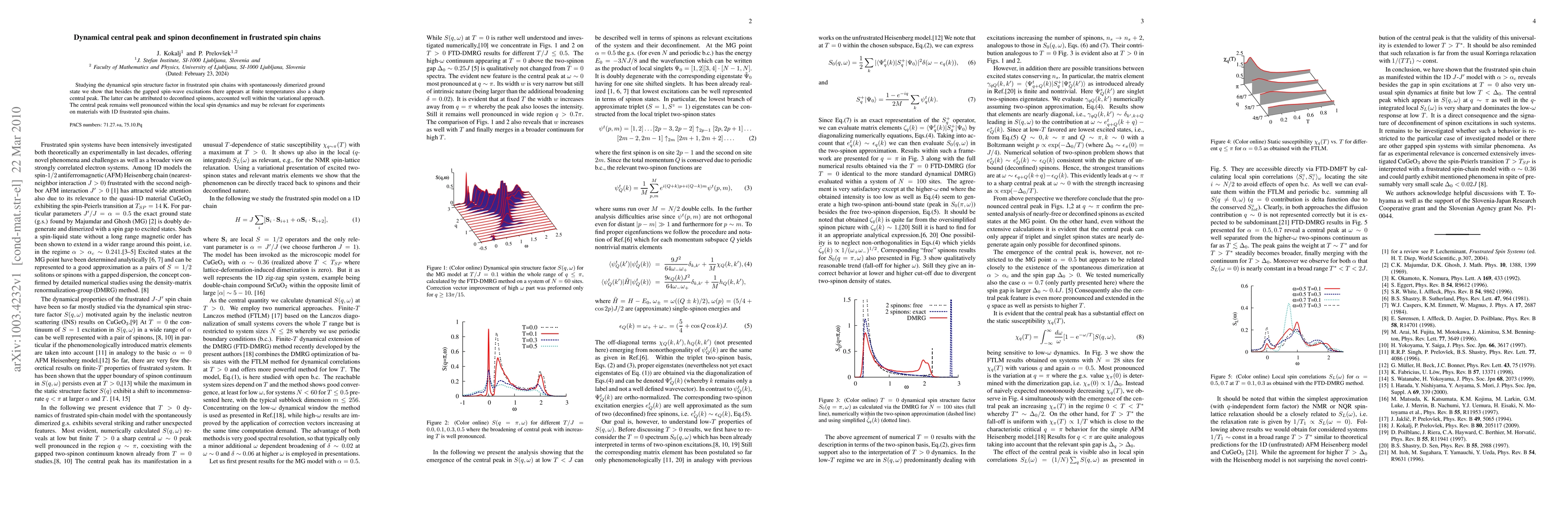 This paper investigates the dynamical spin structure factor in frustrated spin chains, revealing a sharp central peak at finite temperatures due to deconfined spinons, which can be well explained using a variational approach. This central peak's persistence in local spin dynamics may have implications for experimental studies of 1D frustrated spin systems.