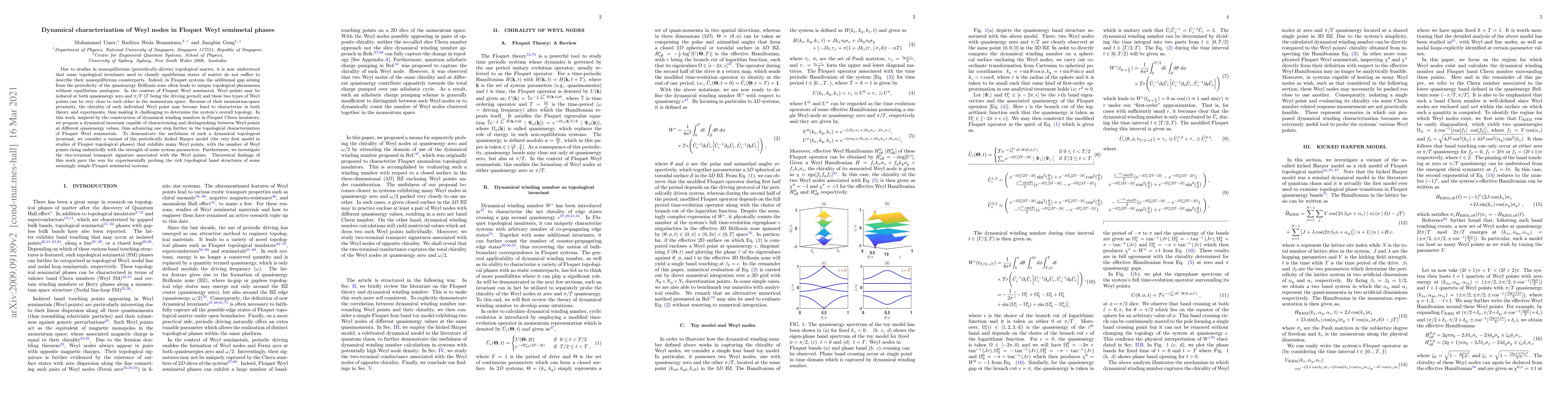 This research proposes a dynamical invariant to characterize and distinguish Weyl points in Floquet Weyl semimetals, which are topologically distinct from equilibrium systems due to nonequilibrium periodic driving. The study demonstrates this invariant using a periodically kicked Harper model, highlighting its potential to advance topological characterization and two-terminal transport signatures in such systems.