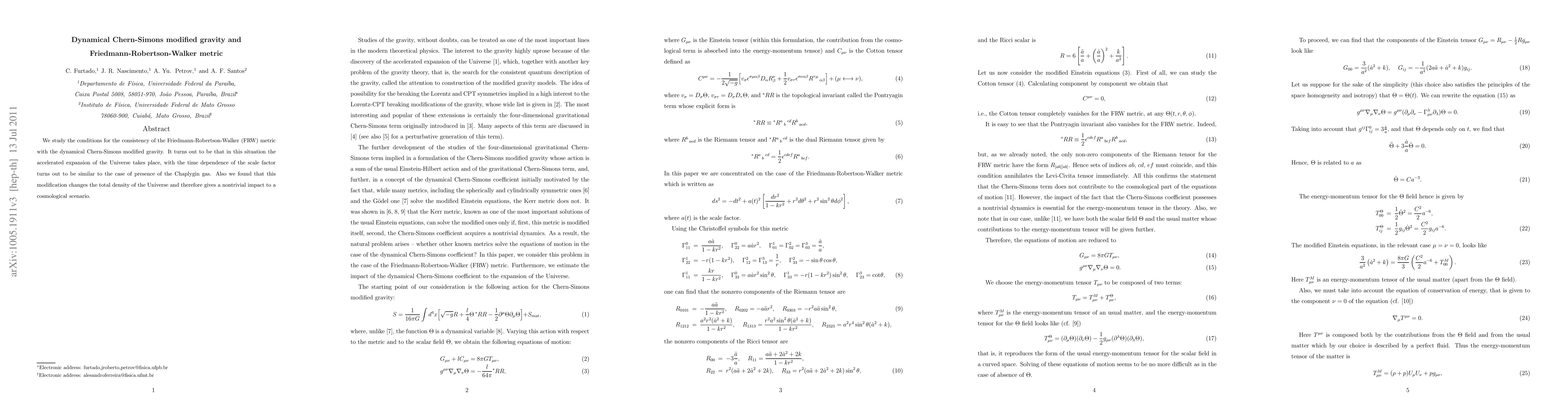 This paper investigates the consistency of the Friedmann-Robertson-Walker (FRW) metric with dynamical Chern-Simons modified gravity, revealing accelerated universe expansion akin to the Chaplygin gas scenario, and demonstrating a nontrivial impact on the universe's total density.