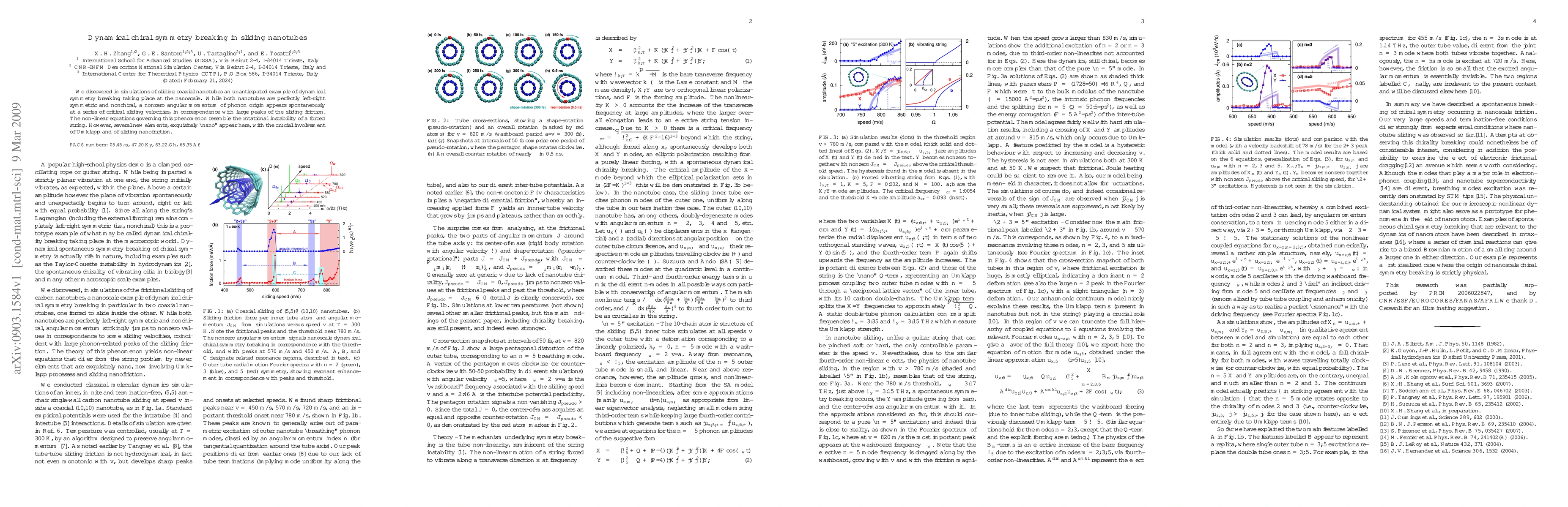We discovered in simulations of sliding coaxial nanotubes an unanticipated example of dynamical symmetry breaking taking place at the nanoscale. While both nanotubes are perfectly left-right symmetric and nonchiral, a nonzero angular momentum of phonon origin appears spontaneously at a series of critical sliding velocities, in correspondence with large peaks of the sliding friction. The non-linear equations governing this phenomenon resemble the rotational instability of a forced string. However, several new elements, exquisitely "nano" appear here, with the crucial involvement of Umklapp and of sliding nanofriction.