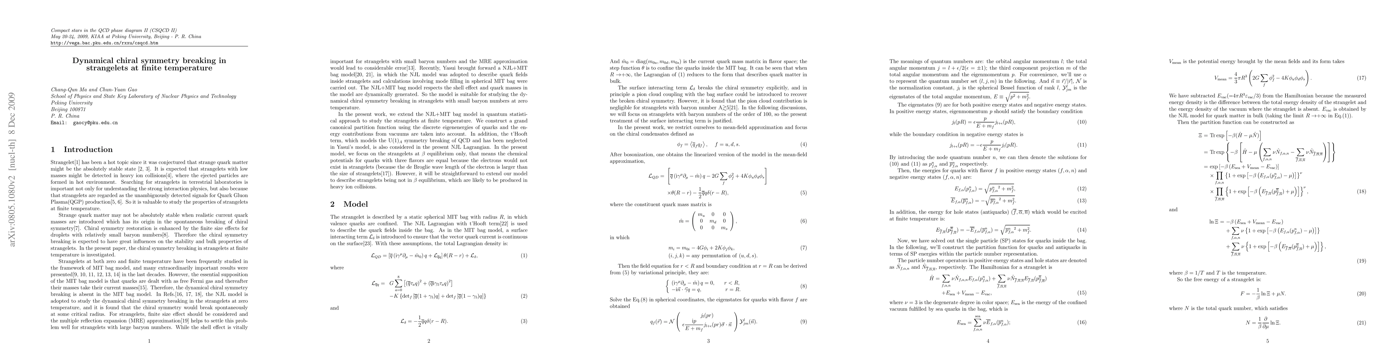 This paper explores a model of strangelets at finite temperature where quark masses are dynamically generated, revealing that chiral symmetry breaks spontaneously at a certain temperature, leading to an increase in strange quark masses as temperature rises. Numerical examples demonstrate the phenomenon of increasing strange quark mass post symmetry breaking.