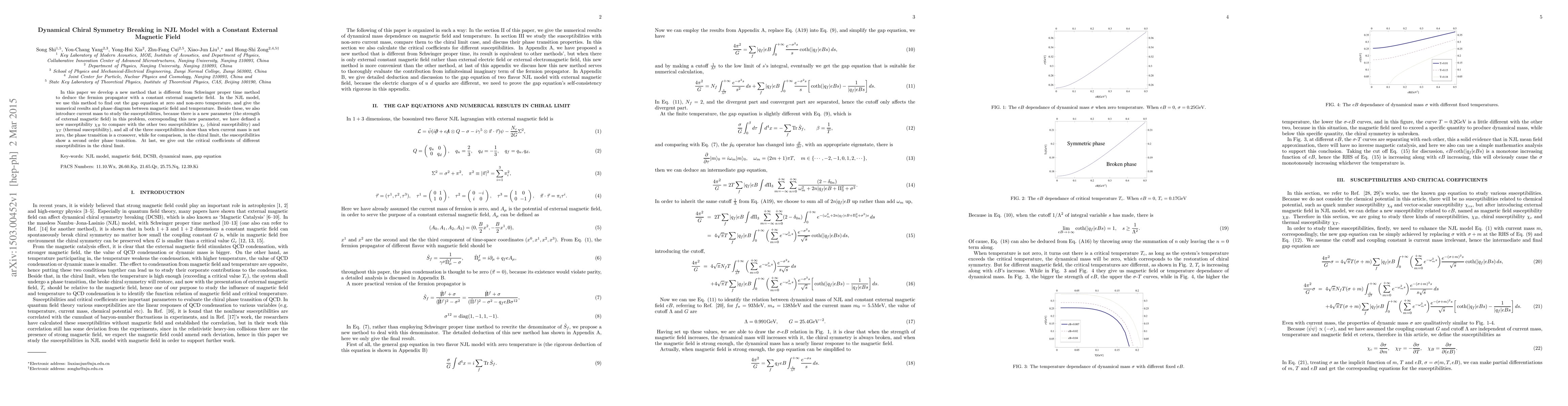 In this paper we develop a new method that is different from Schwinger proper time method to deduce the fermion propagator with a constant external magnetic field. In the NJL model, we use this method to find out the gap equation at zero and non-zero temperature, and give the numerical results and phase diagram between magnetic field and temperature. Beside these, we also introduce current mass to study the susceptibilities, because there is a new parameter (the strength of external magnetic field) in this problem, corresponding this new parameter, we have defined a new susceptibility $\chi_B$ to compare with the other two susceptibilities $\chi_c$ (chiral susceptibility) and $\chi_T$ (thermal susceptibility), and all of the three susceptibilities show than when current mass is not zero, the phase transition is a crossover, while for comparison, in the chiral limit, the susceptibilities show a second order phase transition. At last, we give out the critical coefficients of different susceptibilities in the chiral limit.