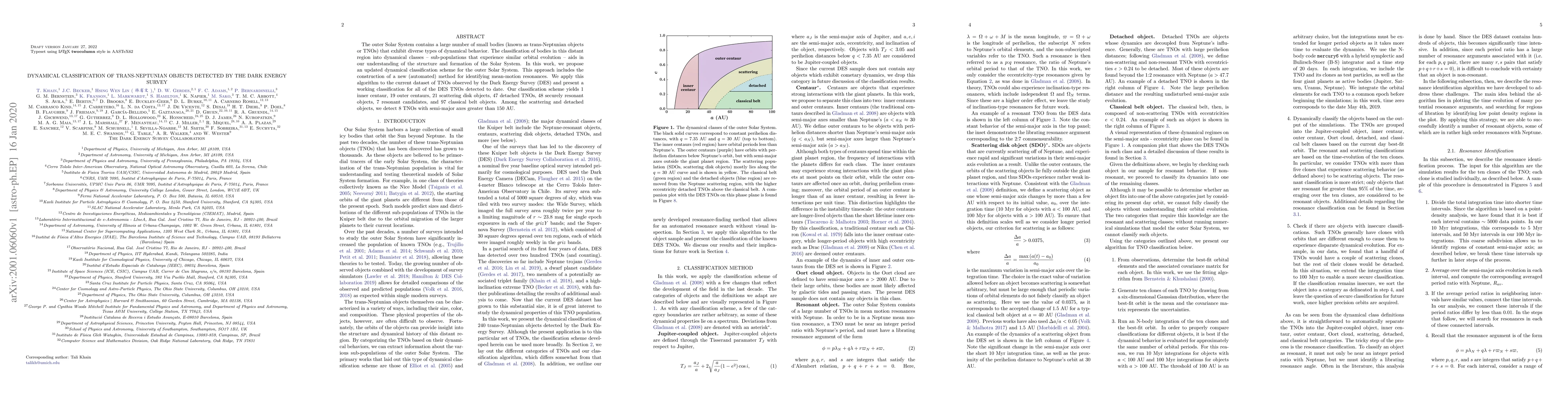This paper proposes an updated dynamical classification scheme for trans-Neptunian objects (TNOs) using an automated method for identifying mean-motion resonances, applied to TNOs detected by the Dark Energy Survey. The classification identifies 97 classical belt objects, 48 resonant objects, and various other sub-populations, including 8 TNOs with semi-major axes greater than 150 AU.