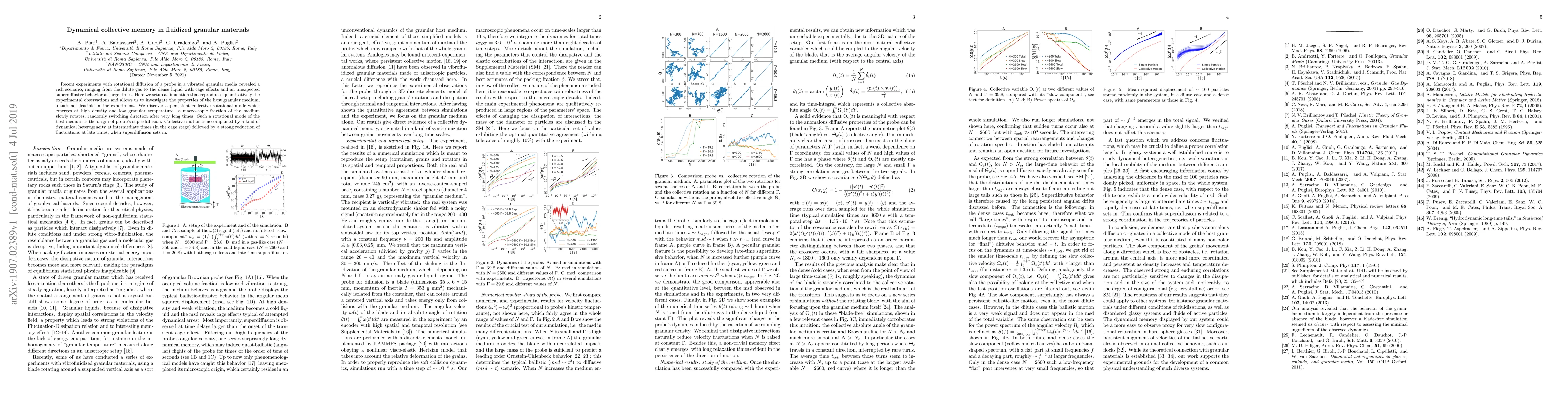Recent experiments with rotational diffusion of a probe in a vibrated granular media revealed a rich scenario, ranging from the dilute gas to the dense liquid with cage effects and an unexpected superdiffusive behavior at large times. Here we setup a simulation that reproduces quantitatively the experimental observations and allows us to investigate the properties of the host granular medium, a task not feasible in the experiment. We discover a persistent collective rotational mode which emerges at high density and low granular temperature: a macroscopic fraction of the medium slowly rotates, randomly switching direction after very long times. Such a rotational mode of the host medium is the origin of probe's superdiffusion. Collective motion is accompanied by a kind of dynamical heterogeneity at intermediate times (in the cage stage) followed by a strong reduction of fluctuations at late times, when superdiffusion sets in.