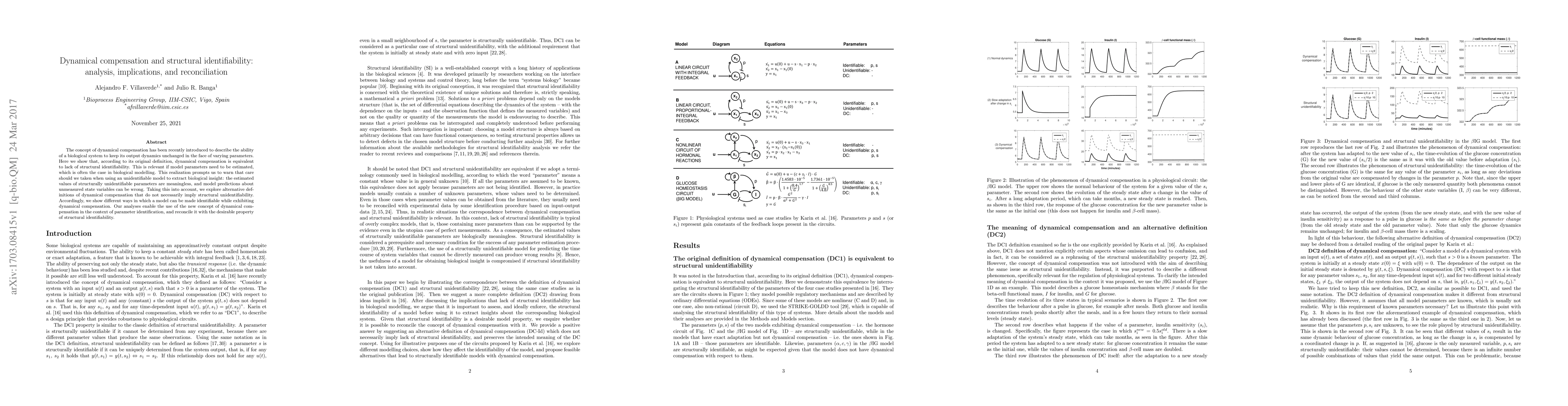 The concept of dynamical compensation has been recently introduced to describe the ability of a biological system to keep its output dynamics unchanged in the face of varying parameters. Here we show that, according to its original definition, dynamical compensation is equivalent to lack of structural identifiability. This is relevant if model parameters need to be estimated, which is often the case in biological modelling. This realization prompts us to warn that care should we taken when using an unidentifiable model to extract biological insight: the estimated values of structurally unidentifiable parameters are meaningless, and model predictions about unmeasured state variables can be wrong. Taking this into account, we explore alternative definitions of dynamical compensation that do not necessarily imply structural unidentifiability. Accordingly, we show different ways in which a model can be made identifiable while exhibiting dynamical compensation. Our analyses enable the use of the new concept of dynamical compensation in the context of parameter identification, and reconcile it with the desirable property of structural identifiability.