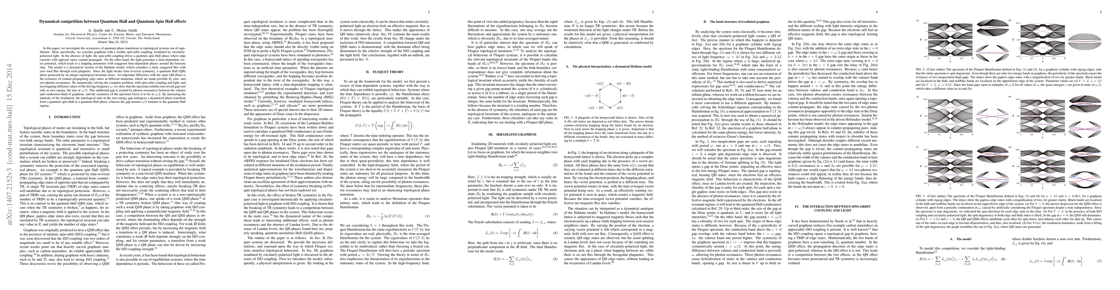 In this paper we investigate the occurrence of quantum phase transitions in topological systems out of equi- librium. More specifically, we consider graphene with a sizable spin-orbit coupling, irradiated by circularly- polarized light. In the absence of light, the spin-orbit coupling drives a quantum spin Hall phase where edge currents with opposite spins counter-propagate. On the other hand, the light generates a time-dependent vector potential, which leads to a hopping parameter with staggered time-dependent phases around the benzene ring. The model is a dynamical version of the Haldane model, which considers a static staggered flux with zero total flux through each plaquette. Since the light breaks time-reversal symmetry, a quantum Hall phase protected by an integer topological invariant arises. By numerically solving the complete problem, with spin-orbit coupling and light, and investigating different values of the driving frequency {\omega}, we show that the spectrum exhibits non-trivial gaps not only at zero energy, but also at {\omega}/2. This additional gap is created by photon resonances between the valence and conduction band of graphene, and the symmetry of the spectrum forces it to lie at {\omega}/2. By increasing the intensity of the irradiation, the topological state in the zero energy gap undergoes a dynamical phase transition from a quantum spin Hall to a quantum Hall phase, whereas the gap around {\omega}/2 remains in the quantum Hall regime.