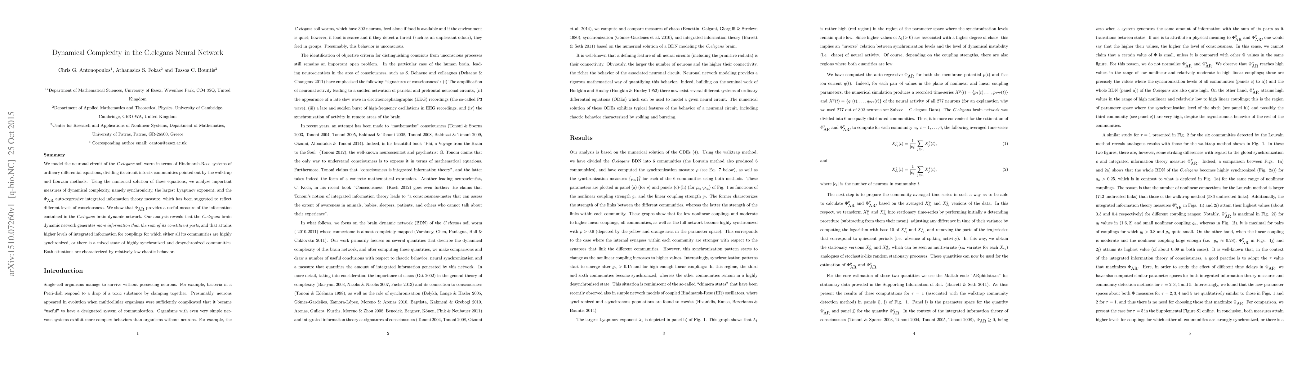 We model the neuronal circuit of the C.elegans soil worm in terms of Hindmarsh-Rose systems of ordinary differential equations, dividing its circuit into six communities pointed out by the walktrap and Louvain methods. Using the numerical solution of these equations, we analyze important measures of dynamical complexity, namely synchronicity, the largest Lyapunov exponent, and the $\Phi_{\mbox{AR}}$ auto-regressive integrated information theory measure, which has been suggested to reflect different levels of consciousness. We show that $\Phi_{\mbox{AR}}$ provides a useful measure of the information contained in the C.elegans brain dynamic network. Our analysis reveals that the C.elegans brain dynamic network generates more information than the sum of its constituent parts, and that attains higher levels of integrated information for couplings for which either all its communities are highly synchronized, or there is a mixed state of highly synchronized and desynchronized communities. Both situations are characterized by relatively low chaotic behavior.
