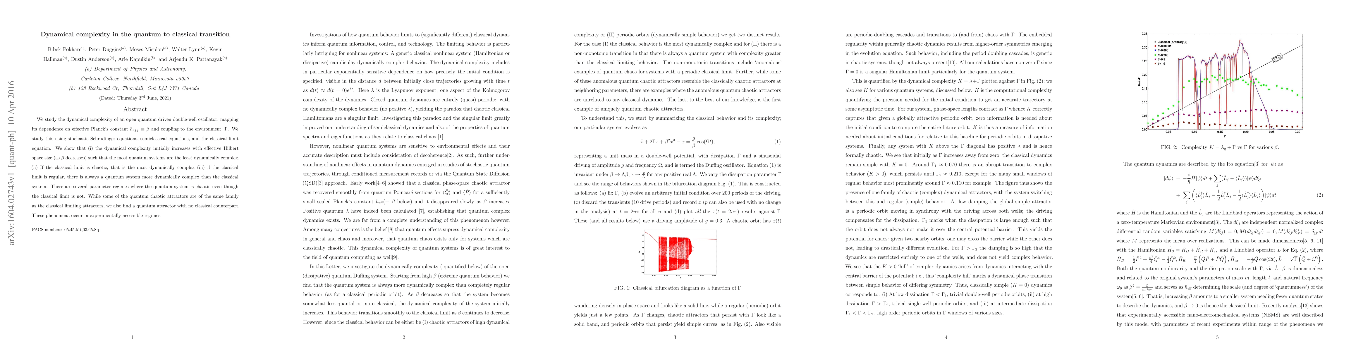 We study the dynamical complexity of an open quantum driven double-well oscillator, mapping its dependence on effective Planck's constant $\hbar_{eff}\equiv\beta$ and coupling to the environment, $\Gamma$. We study this using stochastic Schrodinger equations, semiclassical equations, and the classical limit equation. We show that (i) the dynamical complexity initially increases with effective Hilbert space size (as $\beta$ decreases) such that the most quantum systems are the least dynamically complex. (ii) If the classical limit is chaotic, that is the most dynamically complex (iii) if the classical limit is regular, there is always a quantum system more dynamically complex than the classical system. There are several parameter regimes where the quantum system is chaotic even though the classical limit is not. While some of the quantum chaotic attractors are of the same family as the classical limiting attractors, we also find a quantum attractor with no classical counterpart. These phenomena occur in experimentally accessible regimes.