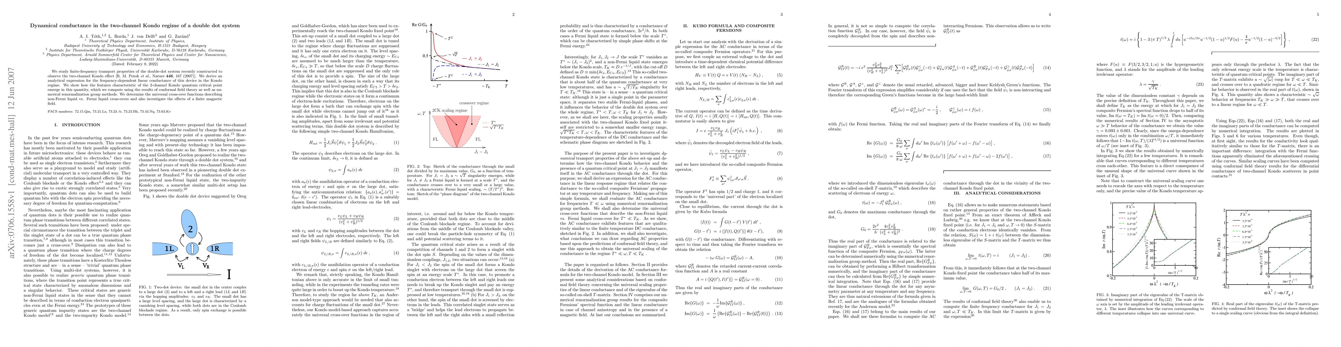 This paper investigates the finite-frequency transport properties of a double-dot system designed to exhibit the two-channel Kondo effect, deriving an analytical expression for its frequency-dependent linear conductance. It reveals the emergence of features characteristic of the 2-channel Kondo quantum critical point, determined through conformal field theory and numerical renormalization group methods, and examines the impact of a finite magnetic field.