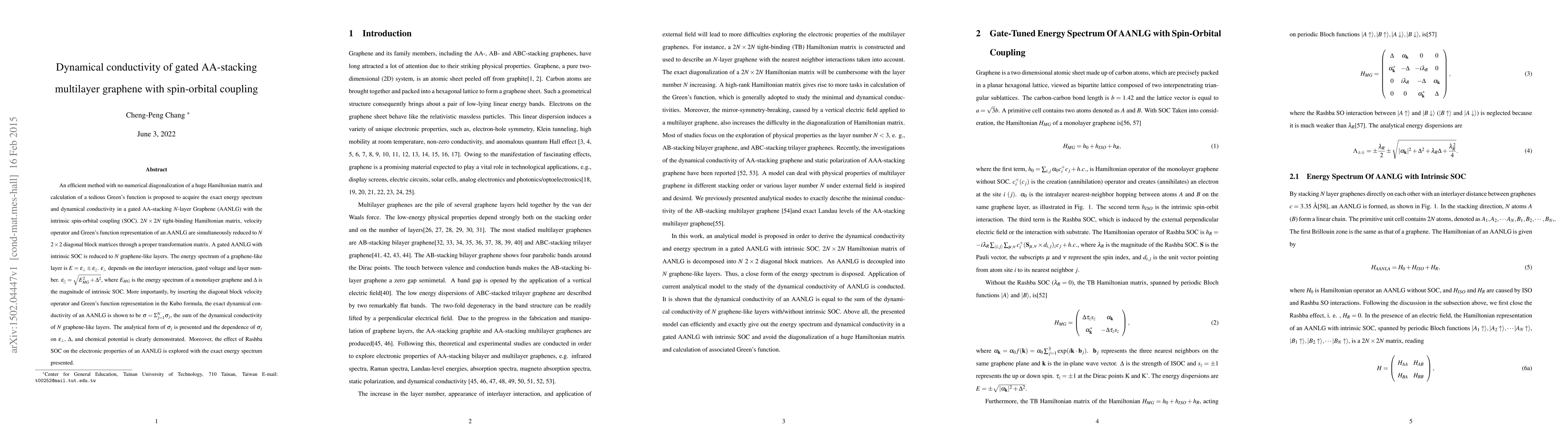 An efficient method with no numerical diagonalization of a huge Hamiltonian matrix and calculation of a tedious Green's function is proposed to acquire the exact energy spectrum and dynamical conductivity in a gated AA-stacking $N$-layer Graphene (AANLG) with the intrinsic spin-orbital coupling (SOC). $2N \times 2N$ tight-binding Hamiltonian matrix, velocity operator and Green's function representation of an AANLG are simultaneously reduced to $N$ $2\times 2$ diagonal block matrices through a proper transformation matrix. A gated AANLG with intrinsic SOC is reduced to $N$ graphene-like layers. The energy spectrum of a graphene-like layer is $E= \varepsilon _{\bot}\pm \varepsilon_{||}$. $ \varepsilon _{\bot}$ depends on the interlayer interaction, gated voltage and layer number. $ \varepsilon_{||}=\sqrt{E_{MG}^2+ \Delta^2}$, where $E_{MG}$ is the energy spectrum of a monolayer graphene and $ \Delta$ is the magnitude of intrinsic SOC. More importantly, by inserting the diagonal block velocity operator and Green's function representation in the Kubo formula, the exact dynamical conductivity of an AANLG is shown to be $\sigma = \Sigma_{j=1} ^N \sigma_j$, the sum of the dynamical conductivity of $N$ graphene-like layers. The analytical form of $\sigma_j$ is presented and the dependence of $\sigma_j$ on $\varepsilon_{\bot}$, $\Delta$, and chemical potential is clearly demonstrated. Moreover, the effect of Rashba SOC on the electronic properties of an AANLG is explored with the exact energy spectrum presented.