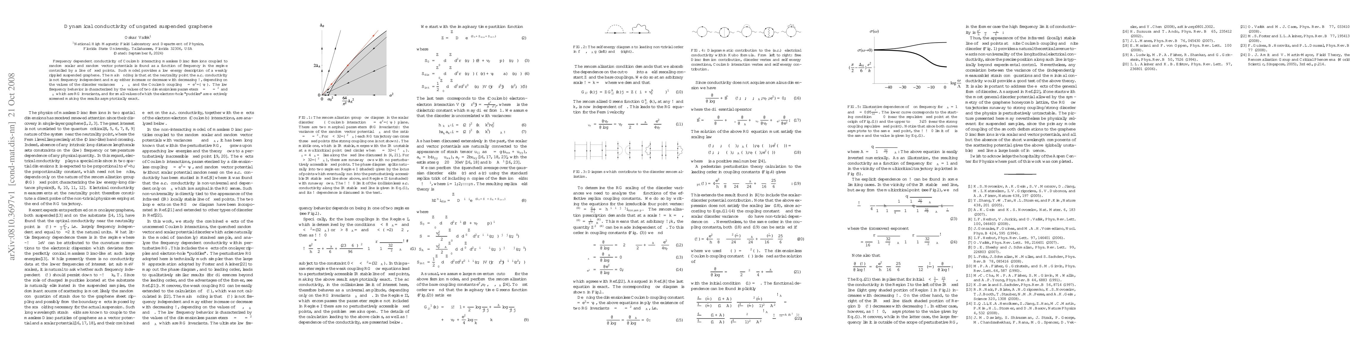 This paper investigates the frequency-dependent conductivity of suspended graphene at the neutrality point, revealing that it is not frequency-independent. The behavior depends on disorder variances and Coulomb coupling, with low-frequency results governed by RG invariants that screen electron-hole puddles for small values.